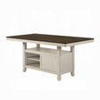 - The Tasnim collection is multifunctional. The counter height dining table features an under-table storage cabinet for kitchenware. The built-in open shelves are the perfect solution for everyday and entertaining table use. The server offers built-in wine storage and spacious drawers ideal for storing linens and stemware. Pick the right seating for your dining room, the counter height chairs provide traditional slatted backrests, and the matching backless stool is padded with nail-head trim. Finished in an oak and antique white, creating the perfect contrast. With plenty of storage and the perfect balance of open and closed space, this Tasnim collection brings a whole new dimension to your dining space.
