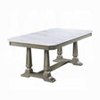 - Style your dining room with an old world, vintage flair. The table combines white artificial marble top and weathered oak finish to create a subtle two-tone effect for a timeless and classic look. Angled corner edges and wood carved details add extra depth and texture to its overall aesthetic appearance. An elaborately carved trestle base under the tabletop offers a balance of grace and strength, providing elegant support to the rectangular tabletop. Your guests will feel warm and cozy in a traditional dining space the Zumala Dining Table creates.