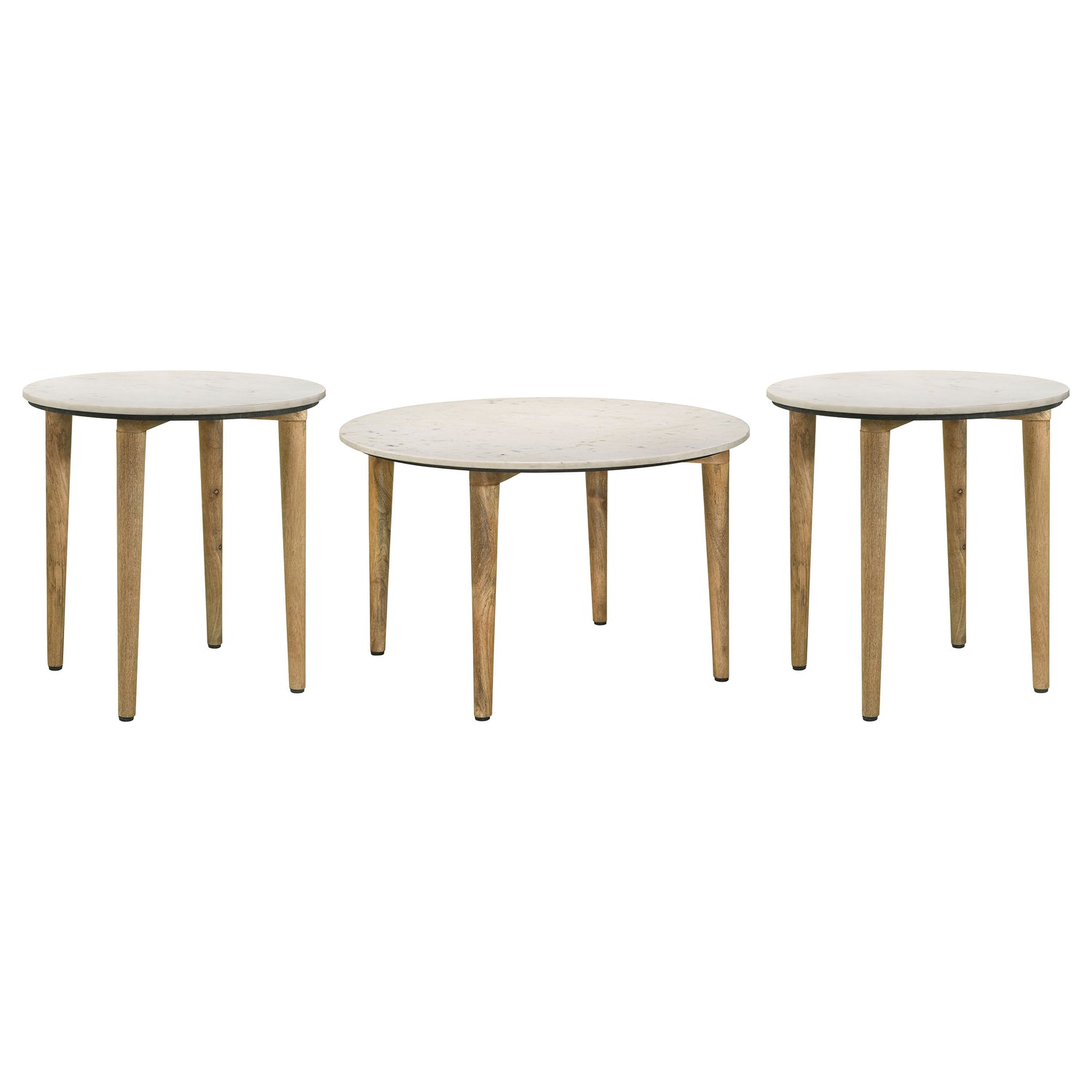 Elevate your living room with this coffee table set, combining a round coffee table and matching end table for a cohesive, natural aesthetic. Crafted with genuine white marble tops, each piece features unique veining that adds artisanal charm. The solid mango wood legs, finished in a natural tone, provide sturdy support and showcase organic grain patterns. Handcrafted in India, this set blends seamlessly with modern, minimalist, or rustic decor. Its earthy tones and durable materials ensure both style and longevity.