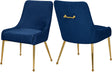 Elegance invades your dining room when you add this Ace velvet dining chair to the mix. This beautiful chair features the bells and whistles you need to take your dining room to the next level decoratively. The chair is outfitted in soft navy velvet upholstery with a pleated design for added textural appeal. Polished gold legs with ball feet and a matching gold handle on the back round out the design on a stylish note.