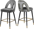Modern and traditional elements collide in the design of this Akoya Grey Velvet Stool. Velvet upholstery covers the back and seat, giving it a decidedly glamorous look while two strategic cutouts provide just a hint of bold, modish fun. The gold nailhead trim on the back adds an edgy vibe, and metal legs in a black finish with goldtone tips rounds out the stool, providing sturdy support and a contemporary look.