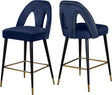 Modern and traditional elements collide in the design of this Akoya Navy Velvet Stool. Velvet upholstery covers the back and seat, giving it a decidedly glamorous look while two strategic cutouts provide just a hint of bold, modish fun. The gold nailhead trim on the back adds an edgy vibe, and metal legs in a black finish with goldtone tips rounds out the stool, providing sturdy support and a contemporary look.