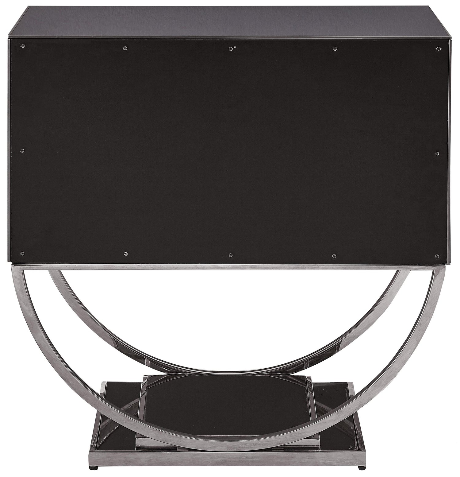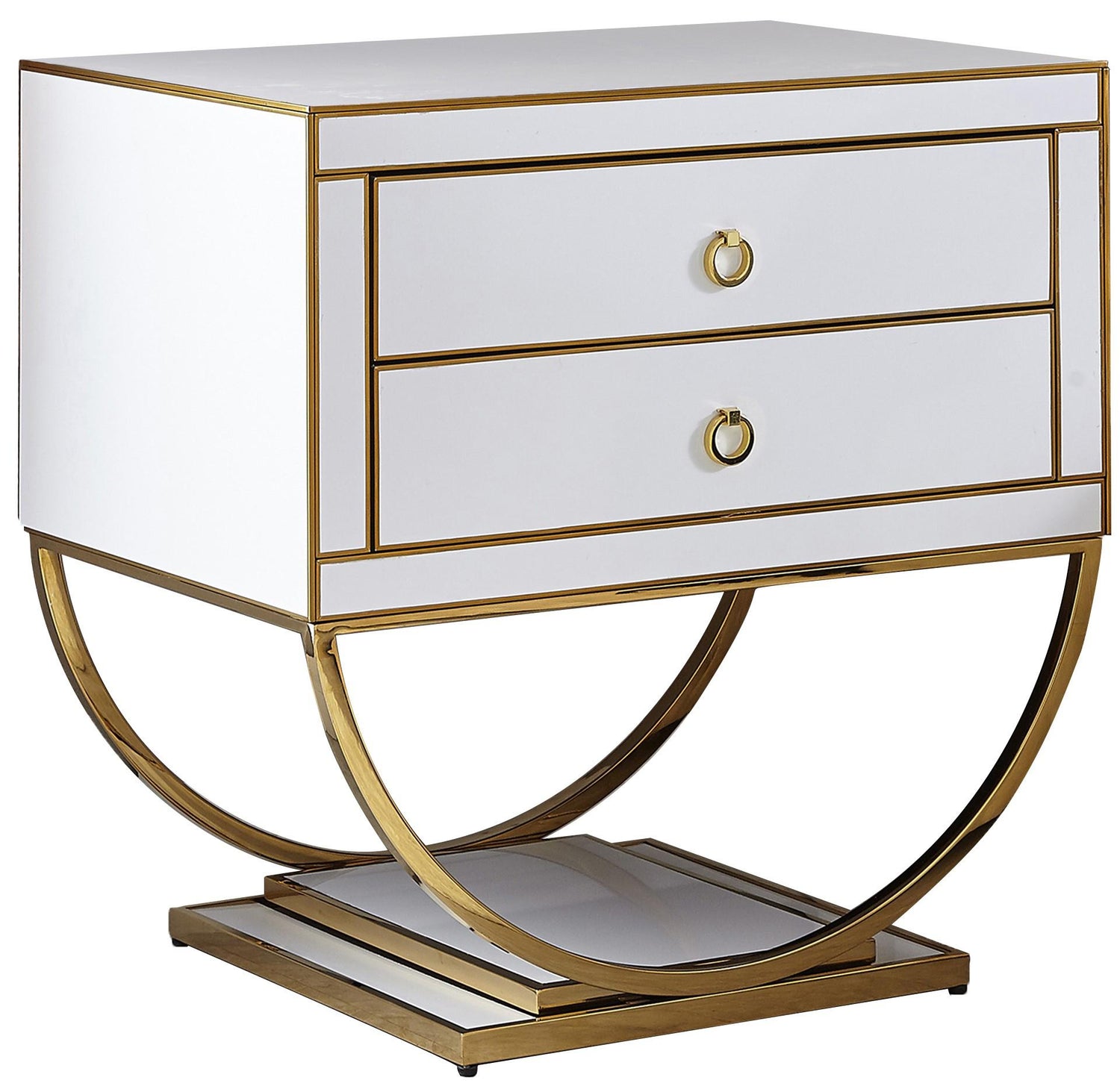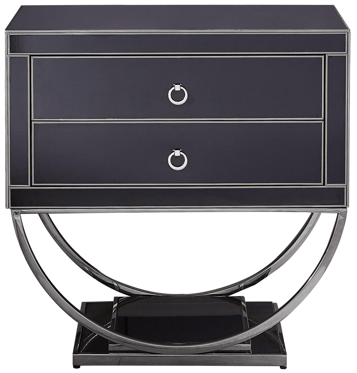 Top off your modern living room with the Alyssa Side Table from Meridian Furniture. This handsome table features a semi-circle base on a dual pedestal for an attention-commanding look. The black glass finish is trimmed in gold for a contrast that's nothing short of stunning. The double drawers help you organize everything from TV remotes to games and DVDs.