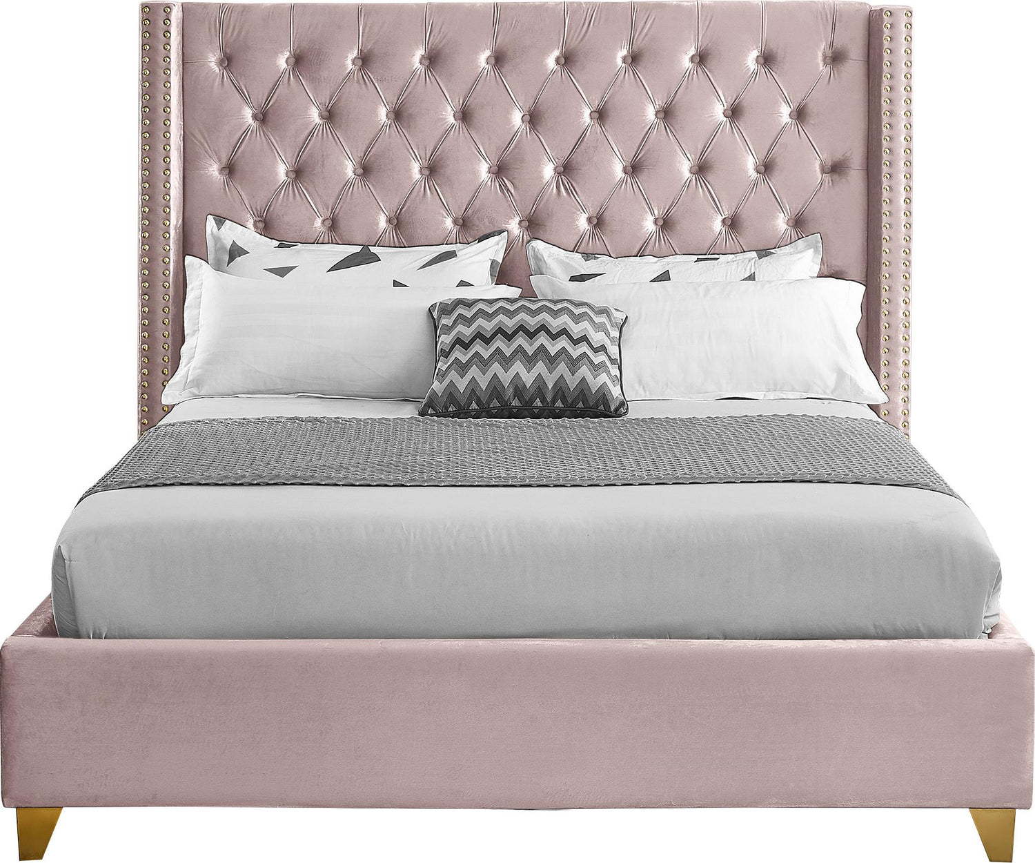 Elegant and eye-catching, the stunning Barolo Bed from Meridian Furniture is the perfect addition to any bedroom. Rich velvet covers the deep tufted design. A beautiful wing bed design is complimented by hand applied gold nail head details. Strength and beauty is guaranteed with a solid wood frame and stainless steel legs.