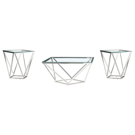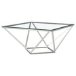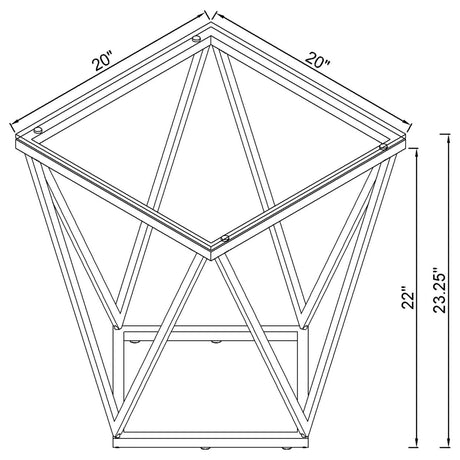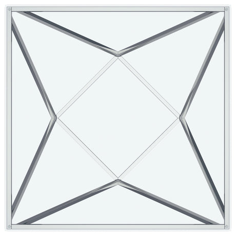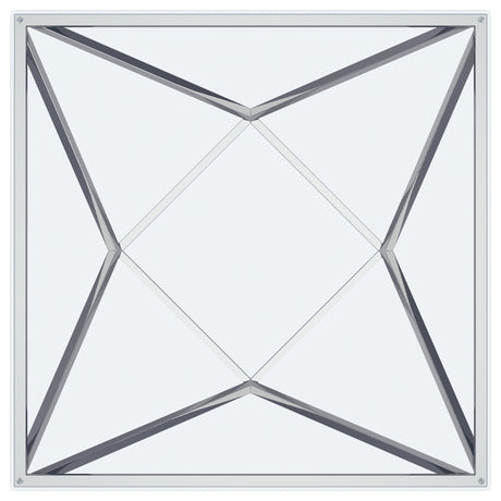 This modern end table showcases a bold geometric base in a polished nickel finish, paired with a durable clear tempered glass top. The tempered glass surface offers scratch resistance and effortless upkeep, while the nickel-finished steel frame ensures lasting stability. Its open framework design brings a contemporary, lightweight aesthetic, ideal for minimalist or industrial-inspired interiors. This versatile accent table blends functionality with style, making it a perfect fit for modern living spaces.