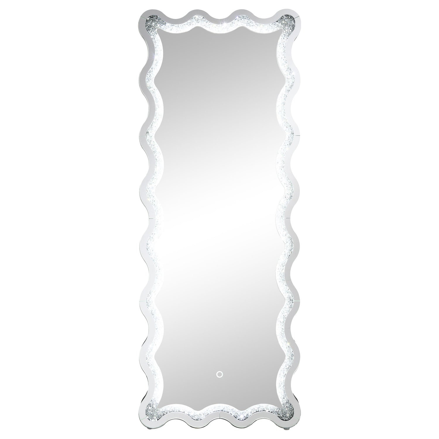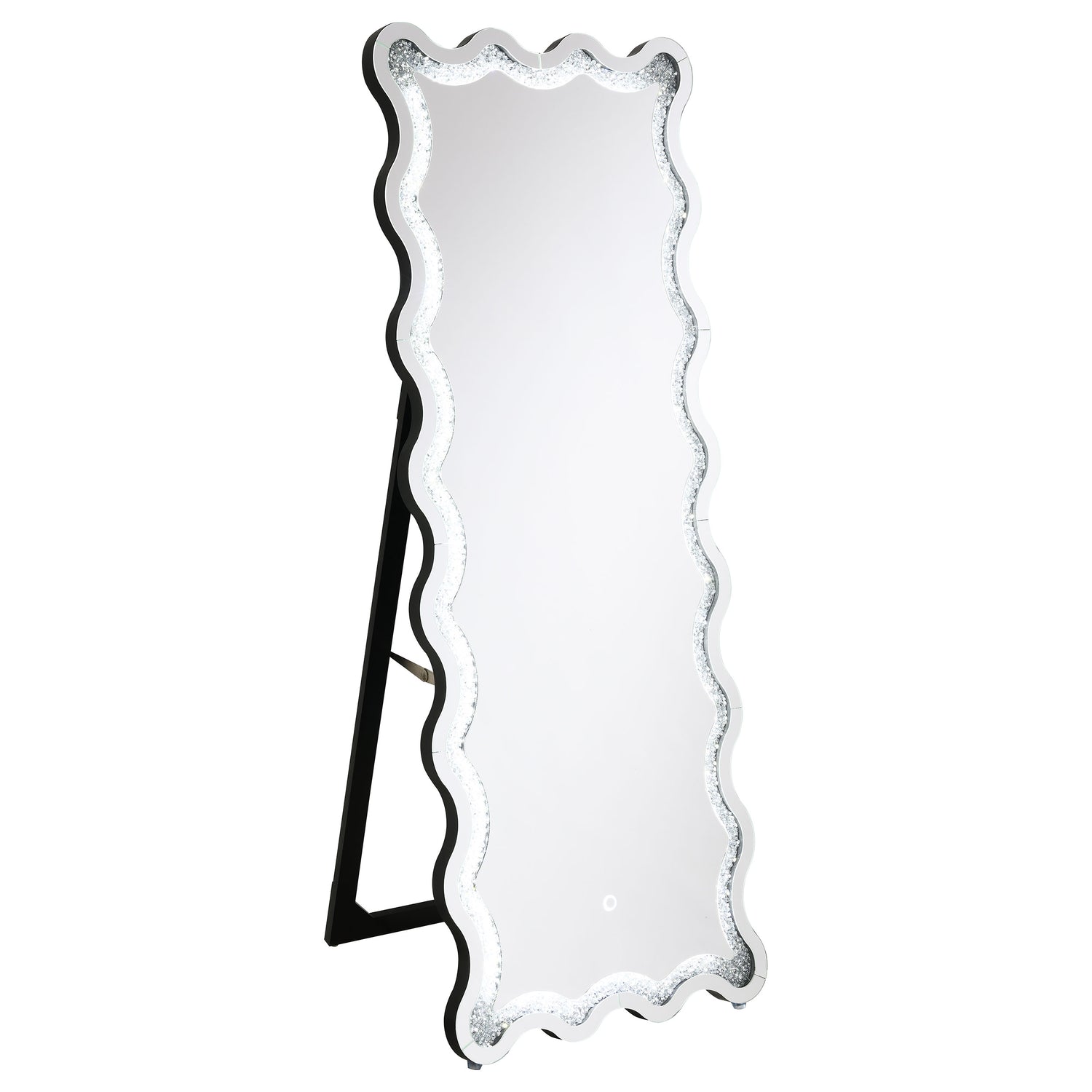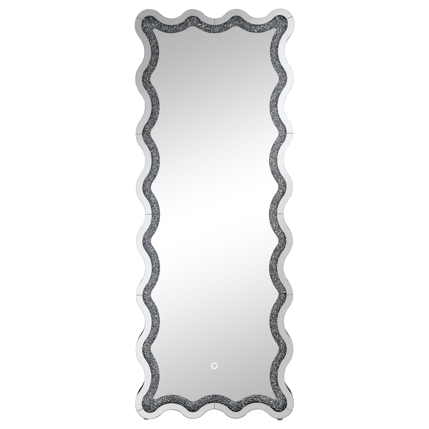 Introduce modern glam sophistication to your bedroom or living area with a contemporary LED floor mirror. It includes a frame that allows it to stand on its own, creating the option for placement anywhere in your space. The mirror boasts a dynamic frame design, with a wavy silhouette created with convex and concave curves that introduce a flowing, engaging ambiance. Mirror and diamond-like trim layers create sparkle and sophistication, perfect for a modern glam bedroom setting. The mirror includes an LED light, perfect for illuminating your daily wardrobe choices in a master suite.