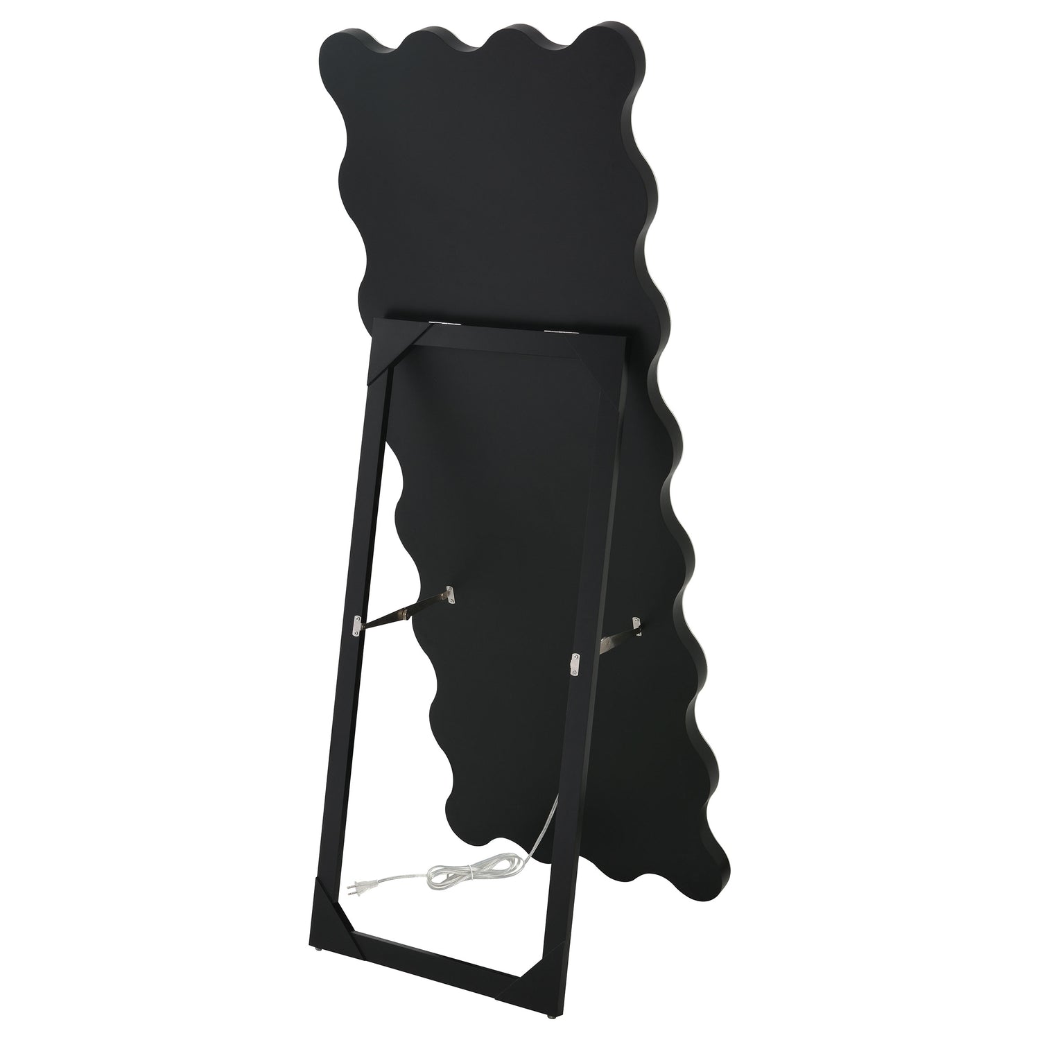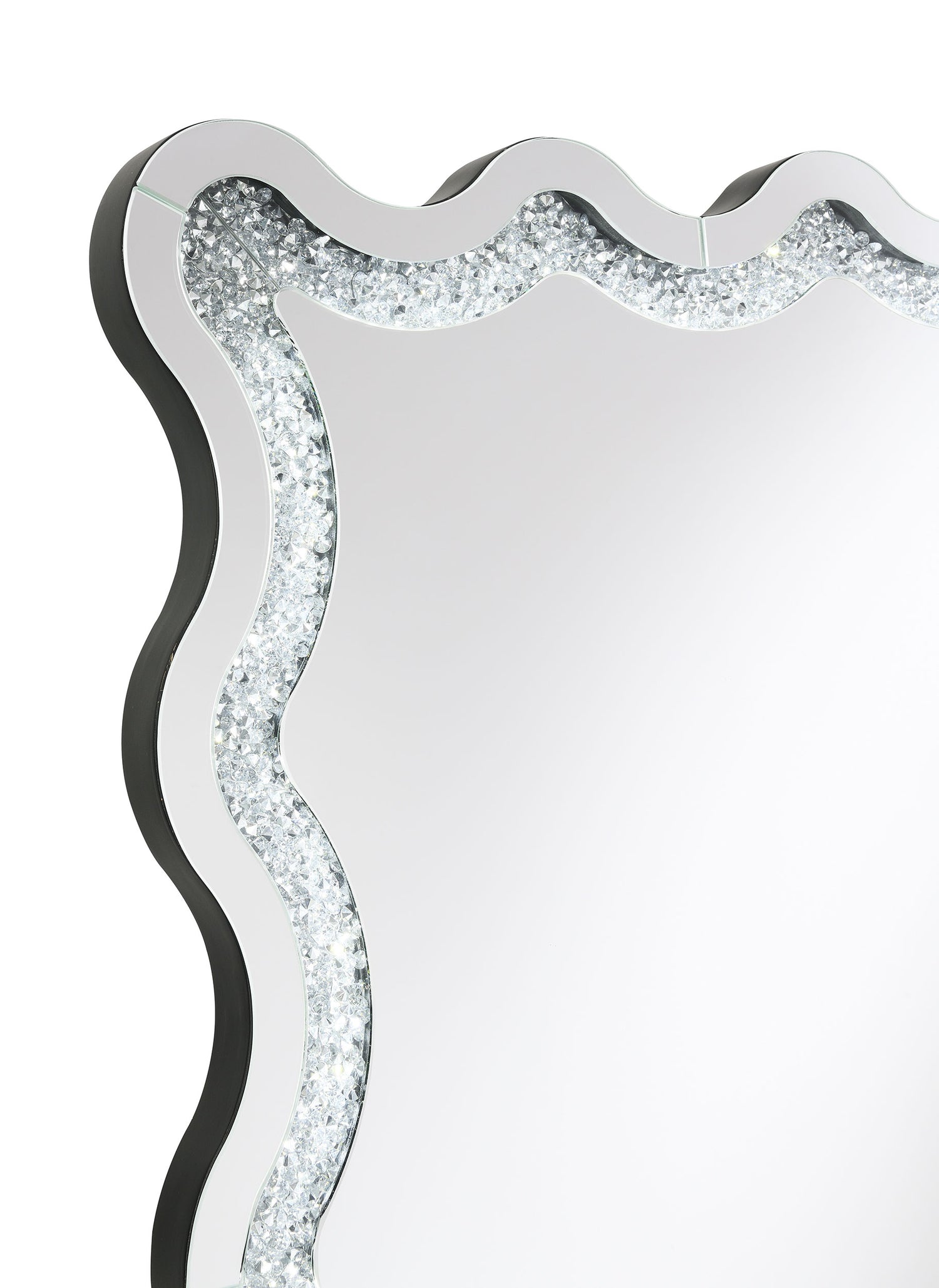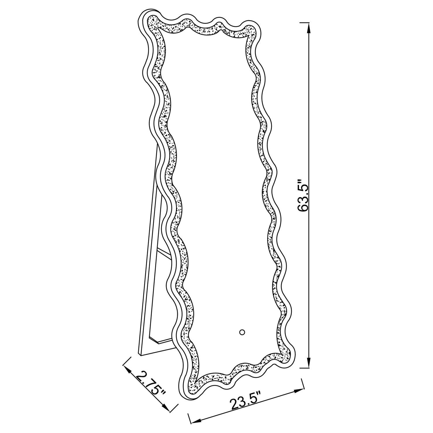 Introduce modern glam sophistication to your bedroom or living area with a contemporary LED floor mirror. It includes a frame that allows it to stand on its own, creating the option for placement anywhere in your space. The mirror boasts a dynamic frame design, with a wavy silhouette created with convex and concave curves that introduce a flowing, engaging ambiance. Mirror and diamond-like trim layers create sparkle and sophistication, perfect for a modern glam bedroom setting. The mirror includes an LED light, perfect for illuminating your daily wardrobe choices in a master suite.