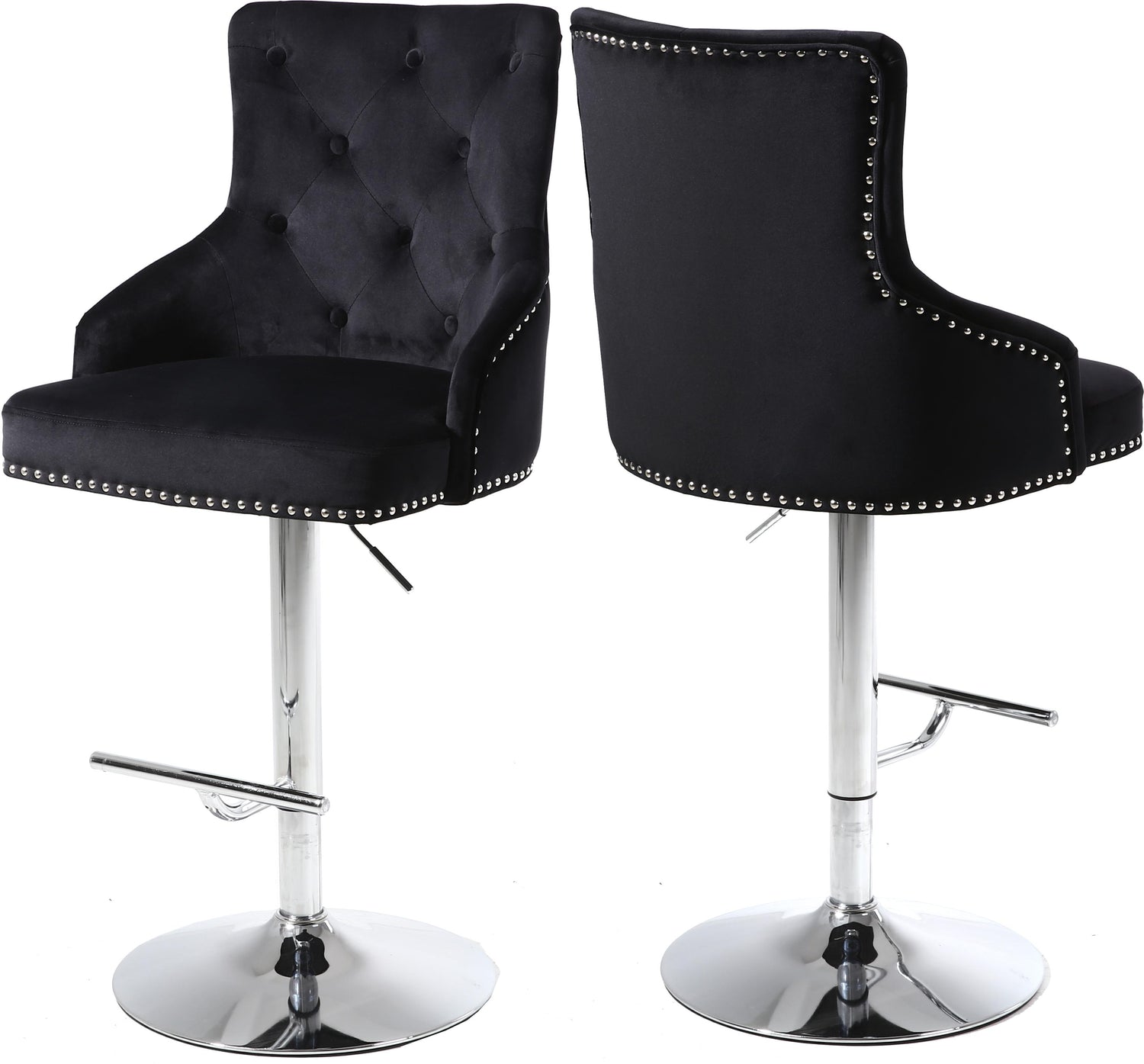 Make this Claude Black Velvet Adjustable Stool everyone's new favorite seat. The high-back design supports guests in comfort, while rich velvet upholstery in a crisp black color gives the stool a svelte, modern look. Chrome nailhead trim adds another level of luxury, and the tufted design enables the cushioned back to keep its loft for maximum comfort. Add it to the bar or the kitchen counter to create a modish vibe in your room.