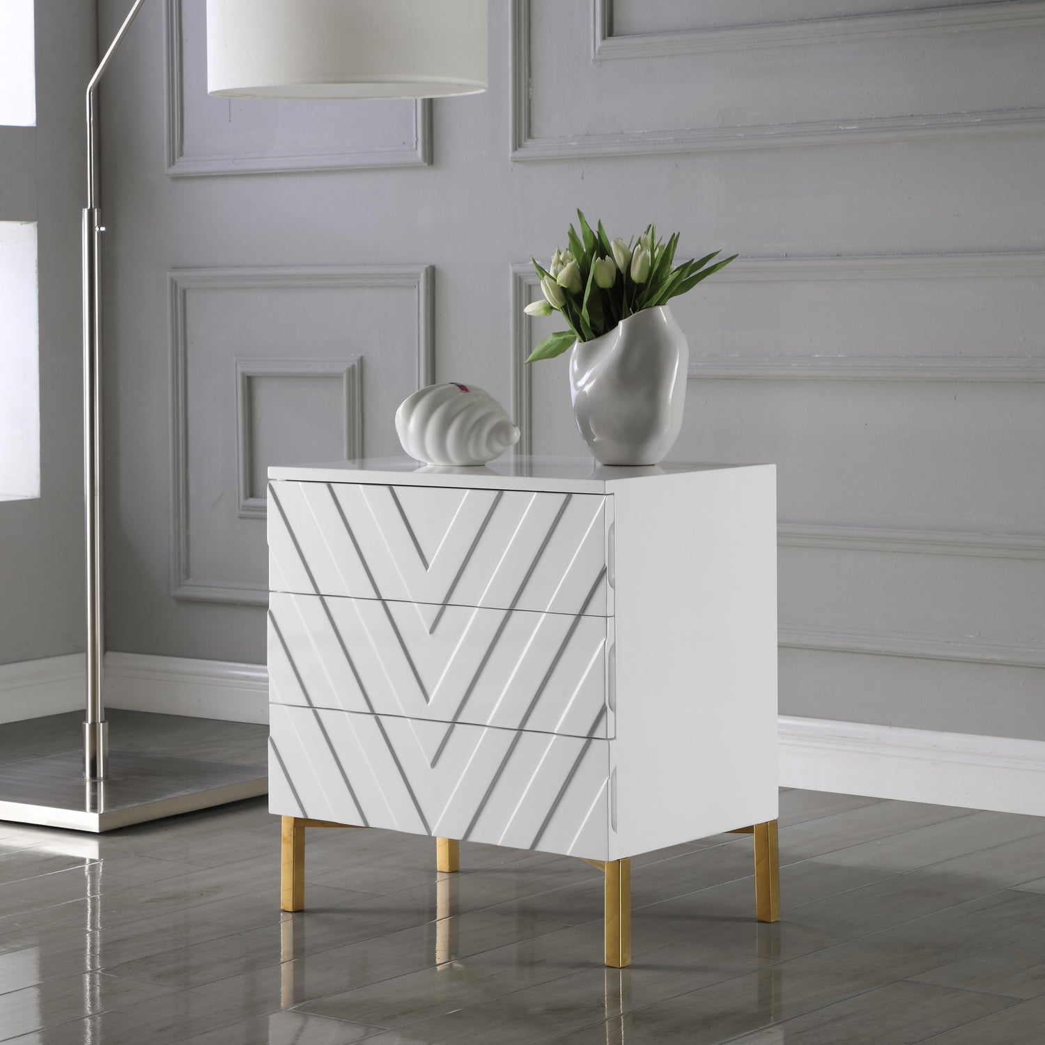 Bring up-to-the-minute style and design to the forefront with this Collette Side Table by Meridian Furniture. The deep navy blue lacquer exterior adds an instant pop of color to your room, and the rich chrome finish on the stainless steel base adds to its modernity and contemporary feel. The Collette Side table has a distinct chevron pattern that traverses its three drawer fronts to form an interesting visual from all angles. An amply sized top lets you rest a lamp or other items easily.