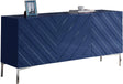 Organize the dining room with the help of this Collette Sideboard Buffet. This Meridian Furniture buffet has a rich chrome stainless steel base that adds a gleaming, modish vibe and chevron navy blue lacquered exterior for a contemporary finish. Use the amply sized top for holding collectibles, photos, and other knickknacks.