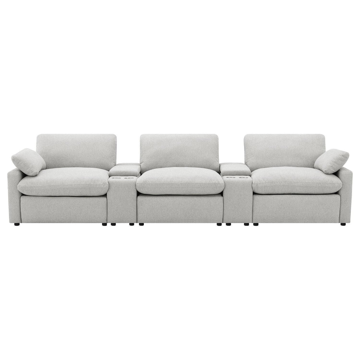 This three-seat home theater seating set combines modern convenience with plush comfort. Each power recliner offers smooth adjustability, while two center consoles feature lift-top storage and dual stainless steel cup holders. Upholstered in soft fabric, the generously padded cushions and pillow-top armrests enhance relaxation. Built for durability and long-lasting support, this seating arrangement is perfect for creating a cozy entertainment space.
