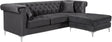 Curl up and take it easy on this two-piece Damian grey velvet reversible sectional sofa. A reversible chaise on one end ensures you have a perfect spot for a nap, and the sectional seats the whole family, making it easy to stay comfortable while you hang out. The deep grey color makes this sectional sofa easy to coordinate with existing items in your home, and its plump backs and plush seats ensure that this piece quickly becomes everyone's favorite seat.