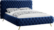 Surround yourself in modern luxury when you add this Delano Navy Velvet Queen Bed to your bedroom oasis. Sumptuous by design, this bed features all-over button tufting for a look that is nothing short of stunning. This dimensional bed features a heavily padded headboard and side rails, each covered in magnificent-to-the-touch navy velvet for a look that's upscale and simply divine. Metal legs on this bed allow easy clearance for vacuuming, and the bed uses just a mattress, so there's no need for a box spring or foundation, which only adds to its sleek look.