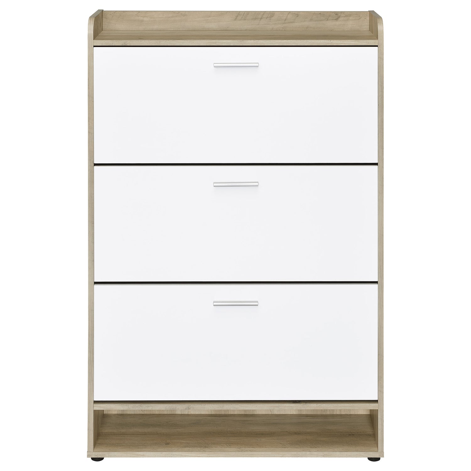Elevate the organization of your entryway with our dual-tone shoe cabinet, a harmonious blend of practicality and contemporary design. This chic cabinet, crafted from robust engineered wood with a realistic wood-look laminate, offers three tiers of shelving for your footwear, each promising to keep your space clutter-free. The sleek top serves as a perfect perch for your decorative touches or daily essentials, while an additional compartment at the base discreetly takes care of extra storage needs. This cabinet seamlessly adapts to your home's aesthetic, ensuring style and function walk hand in hand.