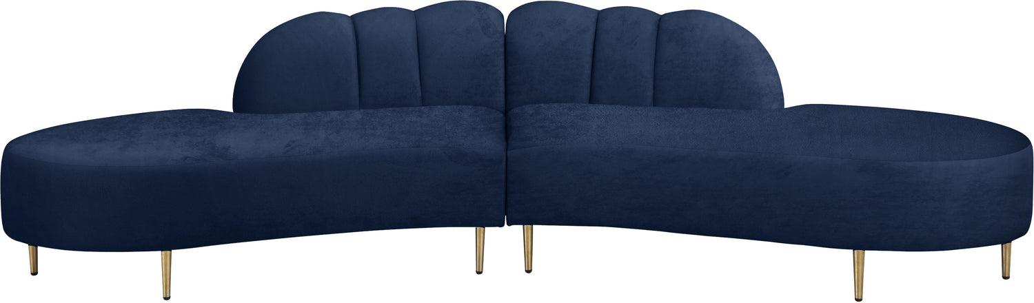 Elevate your interior with the addition of this Divine velvet two-piece sectional. This lovely seating option features navy velvet upholstery covering every last inch, ensuring your total comfort as you lounge the day away. The shell shape and deep channel tufting along with the piece���s gold stainless steel legs lend it an uber contemporary feel that is well-suited for your modern d?�cor.