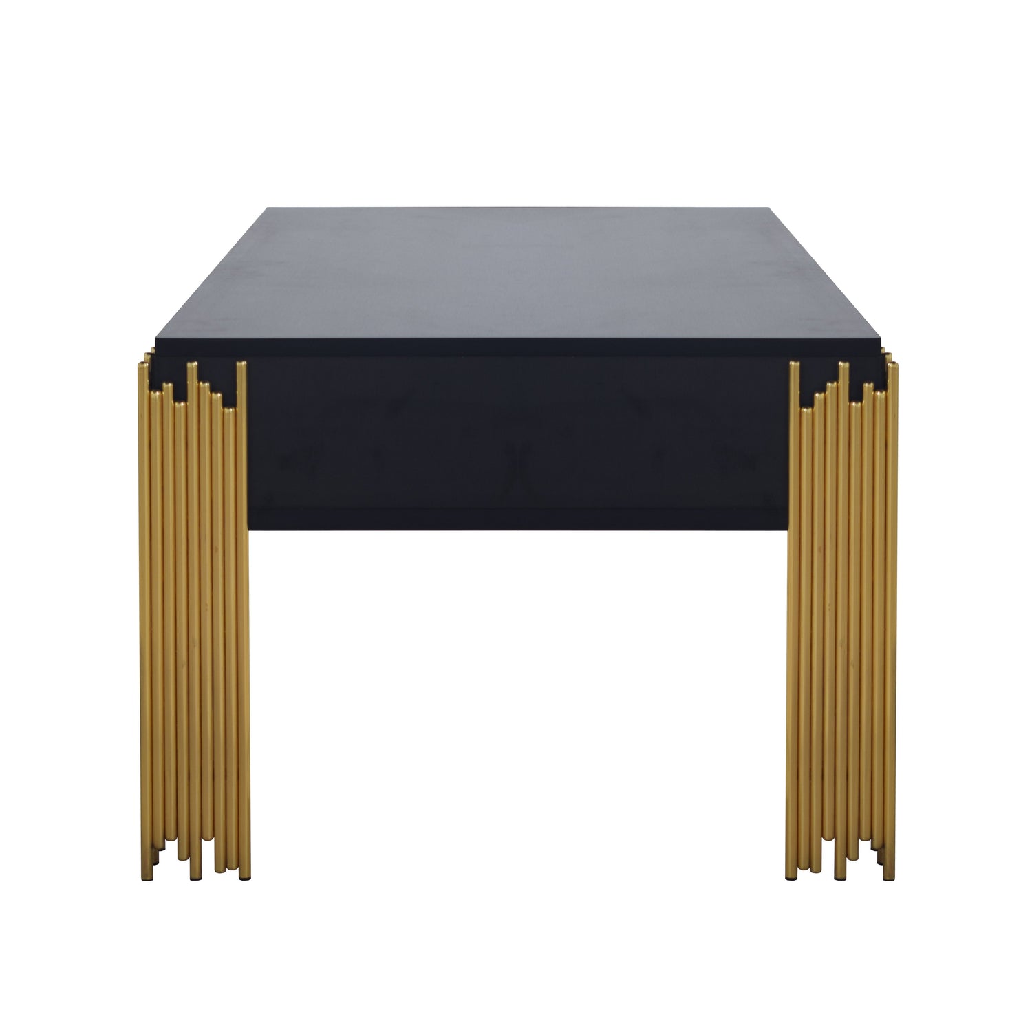 Introducing the Empire Coffee Table, a stylish and functional centerpiece for your living space. Crafted with durable eco-friendly materials and a sleek black finish, this table ensures long-lasting durability while adding a touch of contemporary elegance to your room. Its modern metro style, featuring gleaming gold tiered legs, evokes the enchanting allure of a city skyline under the stars. Enjoy convenient storage with two drawers, perfect for keeping remotes and other living room essentials organized and within reach. Elevate your living area with the Empire Coffee Table, where style meets practicality.