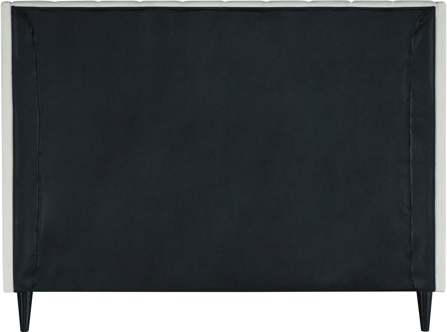 Snuggle up to a pet or other loved one in this richly upholstered Eva cream velvet queen size bed for the ultimate in rest and relaxation. The wing back headboard has cushioned vertical deep channel tufting, and both the side rails and footboard are upholstered too for your comfort. Tapered black wood legs match the upholstery and support this contemporary bed, elevating it sufficiently that you can store items underneath.