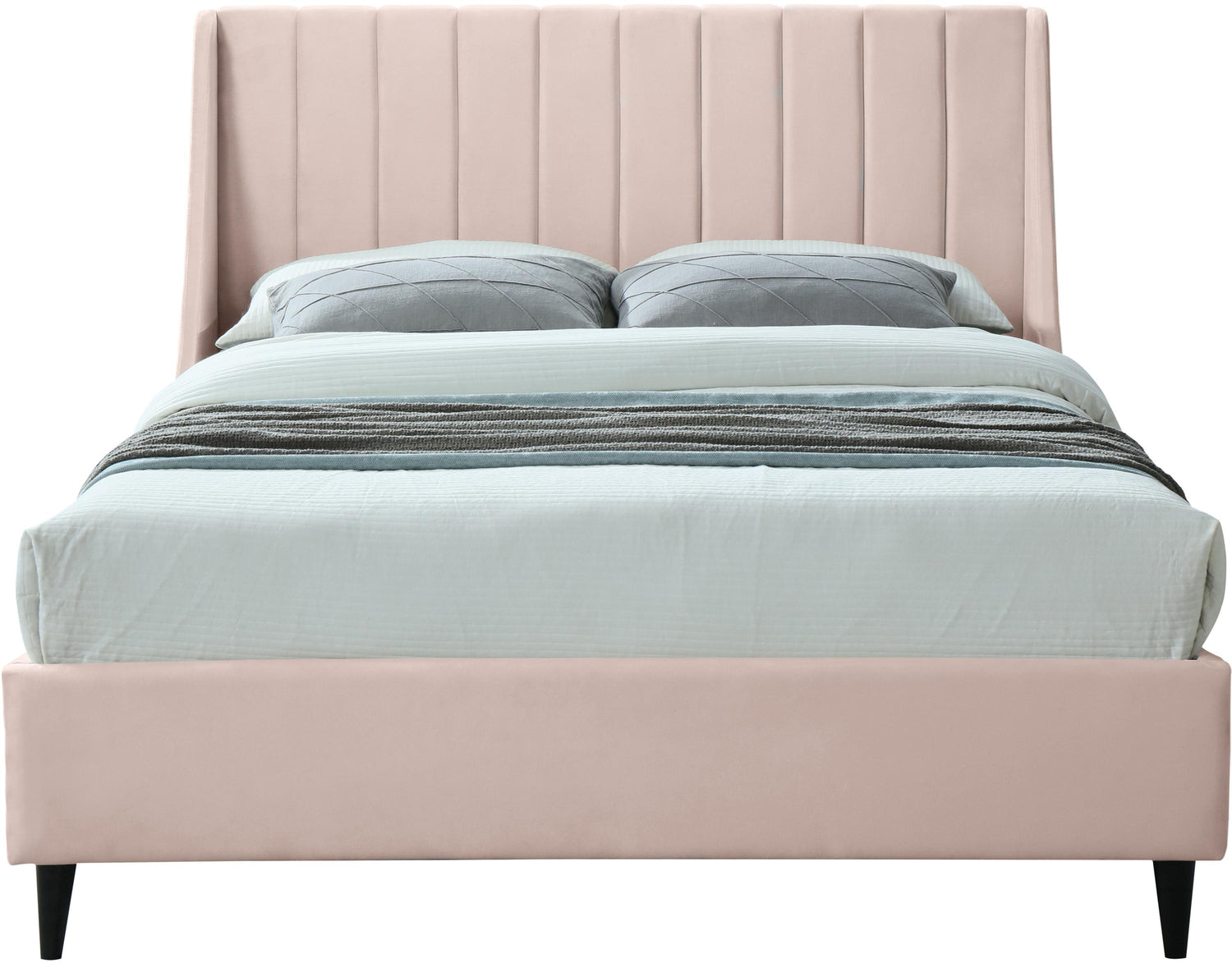 Snuggle up to a pet or other loved one in this richly upholstered Eva pink velvet queen size bed for the ultimate in rest and relaxation. The wing back headboard has cushioned vertical deep channel tufting, and both the side rails and footboard are upholstered too for your comfort. Tapered black wood legs match the upholstery and support this contemporary bed, elevating it sufficiently that you can store items underneath.