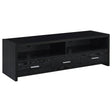 Sleek and modern, this TV console is a stylish choice. Exquisitely crafted from black oak, it boasts a classy, contemporary appeal that looks lovely in a den or family room. Brushed silver hardware creates a striking contrast to its bold, black finish. Three large drawers and two spacious compartments offer plenty of storage for electronics, games, movies, and more. Whether you're gathering loved ones for movie night or enjoying a gaming marathon, this console provides hours upon hours of entertainment.