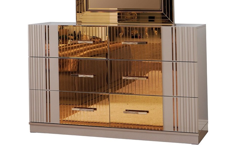 Welcome to a new era of bedroom furniture. Expertly crafted with artistic influence using premium materials for assured quality. This bedroom set is a true spectacle of art. Designed with Metallic River sand-colored imprinted premium upholstery and beautiful bronze mirror accents, this premium bedroom set will become a unique element of magnificence and expression in your bedroom. What truly makes this bed unique is its prodigious headboard, which is wrapped with premium fabric and exclusive tufting from sophisticated technological processes. The common theme throughout this bedroom set is its mirror accents that genuinely give this set a modern luxurious look. The set includes a Dresser. There is plenty of storage space to have all your essentials designated in your bedroom. Slender shapes and simple straight lines enhance the beauty and exciting detail. To mesmerize your bedroom, you should possess this luxury, modern contemporary bedroom set before it is too late.