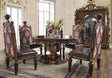 \nSpeak to an Account Rep \n(Min Qty 3 Sets) ETA 12-16 Weeks @ Market Price - If No Domestic Stock Available \n \nDimensions: Table: 60*60*32 Side Chair: 27*28*56 \nFinish: Burl & Metallic Antique Gold \nUpholstered Material: Fabric Back / Leather Seat \nFrame Material: Wood/Composite \n