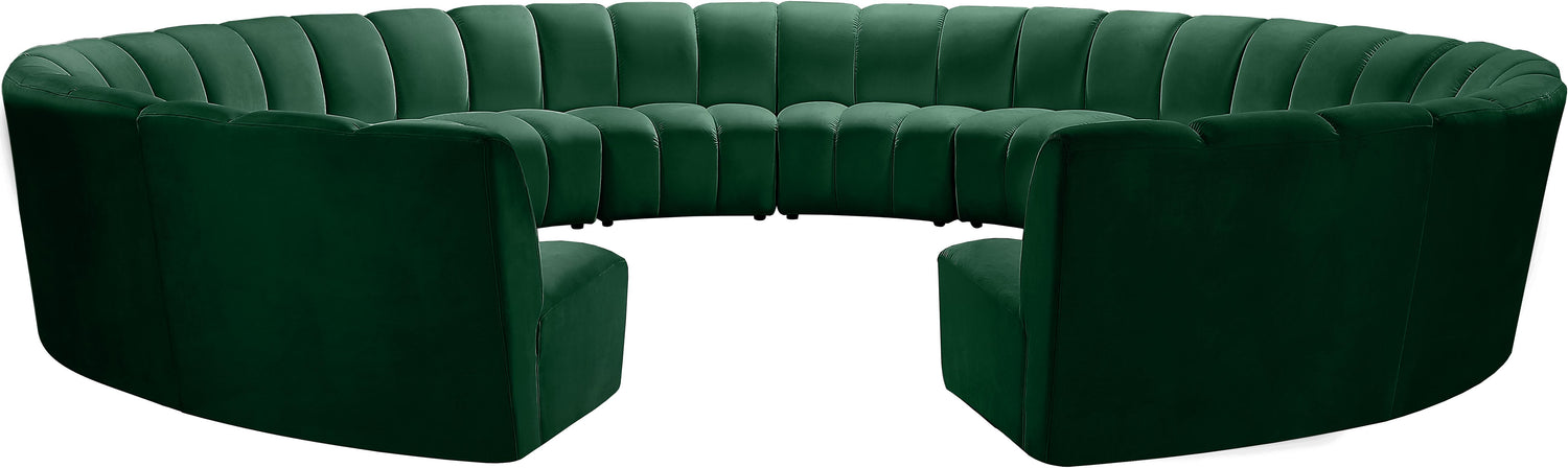 Create a seating group that works for every possible situation with this Infinity 12-piece sectional and other pieces in the Infinity collection. Upholstered in soft green velvet material that feels great against the skin and offers long-wearing beauty, this piece fits with other Infinity items for an infinite number of combinations that get your seating requirements just right but that look just as nice when used on their own.