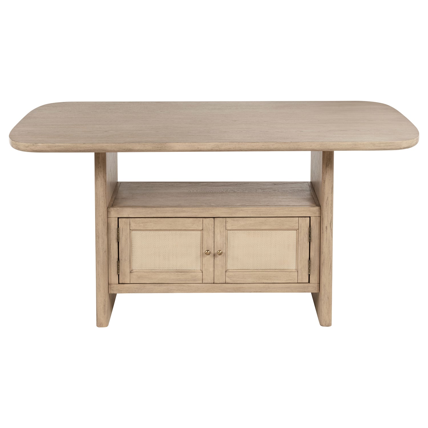 Create a stylish and functional dining space with this beautifully crafted counter-height dining set. Featuring a spacious counter-height table and matching chairs, this set brings natural elegance and modern comfort to your home. The table is crafted from solid wood, engineered wood, and oak veneer, with a smooth rectangular top and rounded edges for a refined look. Its base includes a convenient two-door cabinet, offering storage for dining essentials. The accompanying counter-height chairs feature hand-woven radio weave cane backrests and foam seat cushions upholstered in soft beige fabric for maximum comfort. Complete with brass-finished footrests for durability, this set is perfect for casual family meals or entertaining guests. Key Features: • Counter-height dining set includes a table and six matching chairs • Table crafted from solid wood, engineered wood, and oak veneer with a two-door cabinet base • Chairs feature hand-woven radio weave cane backrests and foam seat cushions upholstered in beige fabric • Brass-finished footrests on chairs for added durability and comfort • Blends natural elegance with practical functionality for modern or traditional spaces