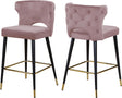 Sit comfortably on this Kelly Pink Velvet Stool. The back and seat cushions are plumply stuffed for enhanced comfort and covered in rich velvet upholstery to give your room a burst of color and jewel-toned fun. This stool has black metal legs with gold tips for added contemporary panache, and it's built strong and tough, so it stands up to heavy daily use without breaking a sweat. These stools can outfit any bar or kitchen counter area.