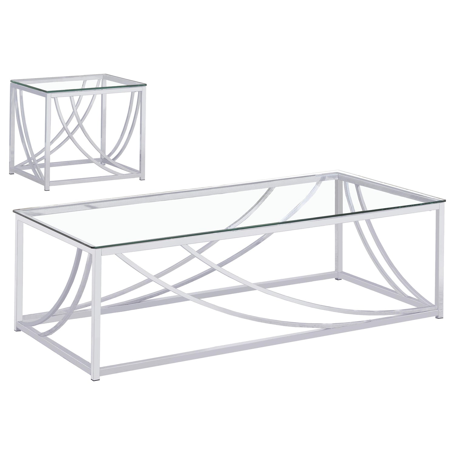 This coffee table set, including a cocktail table and end table, blends sleek modern design with practical functionality. Both pieces feature clear tempered glass tops and electroplated polished chrome frames. The curved metal accents add a contemporary, elegant touch to the design. Built with sturdy metal construction, this set is durable and stylish, making it a perfect addition to any living room or seating area.