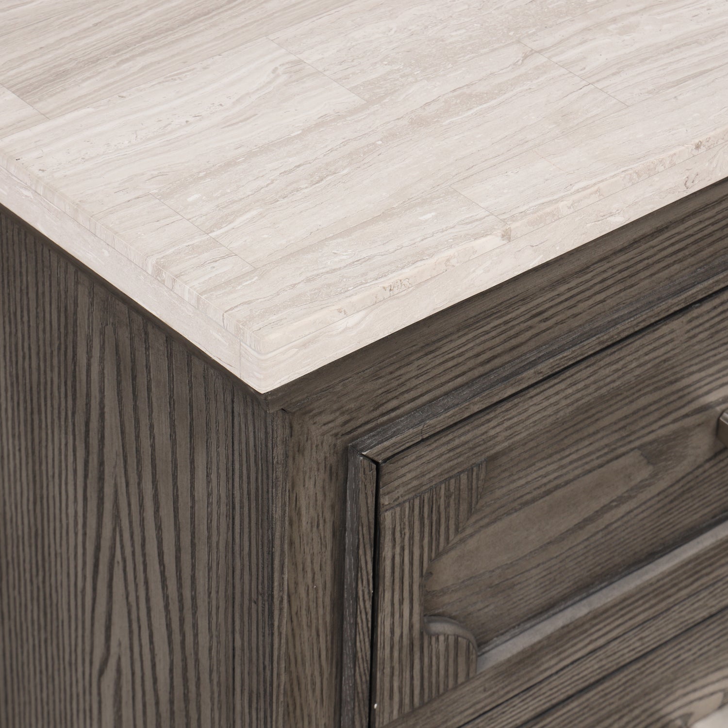 Elevate your bedside with the Lisbon Marble Top Nightstand in Gray. Crafted from Acacia solid wood and eco-friendly embossed oak laminate, this nightstand promises lasting strength and durability. Its multi-step gray finish enhances the natural beauty of the wood, infusing your space with a sophisticated ambiance. A genuine white marble top adds distinct character and provides a long-lasting surface. The heirloom drawer construction ensures durability and functionality, with English and French dovetail joinery, full extension glides, and finished interiors. Top drawers are lined with felt to protect delicate items. Combining traditional elements like bracket feet and picture frame moldings with modern brushed pewter hardware and a fresh gray finish, this nightstand offers a timeless style with a contemporary twist. The Lisbon Marble Top Nightstand is the perfect blend of elegance and practicality for your bedroom.