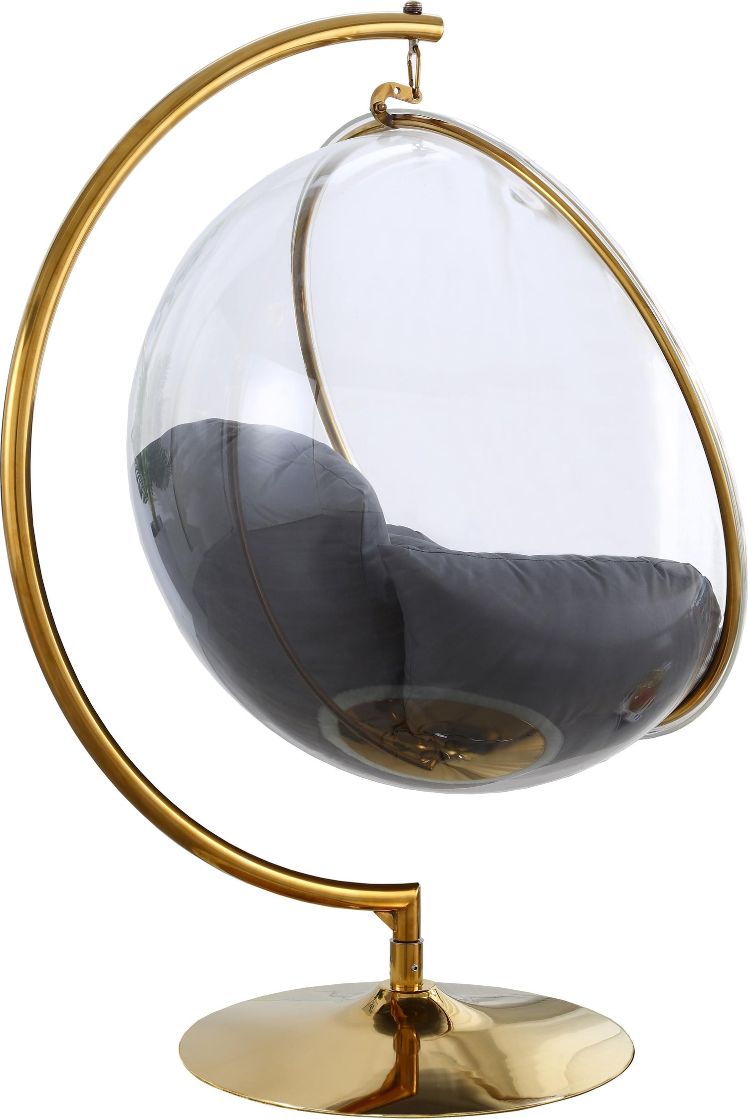 Retreat to your own little bubble, literally, in this Luna acrylic swing bubble accent chair. What a modish addition to your living room, bedroom or other space! This Luna chair features an acrylic egg-style seat topped with grey fabric-covered cushions for supreme comfort. The gold metal base and frame provides sturdy support so that you can chillax to your hearts content in your very own sanctuary.