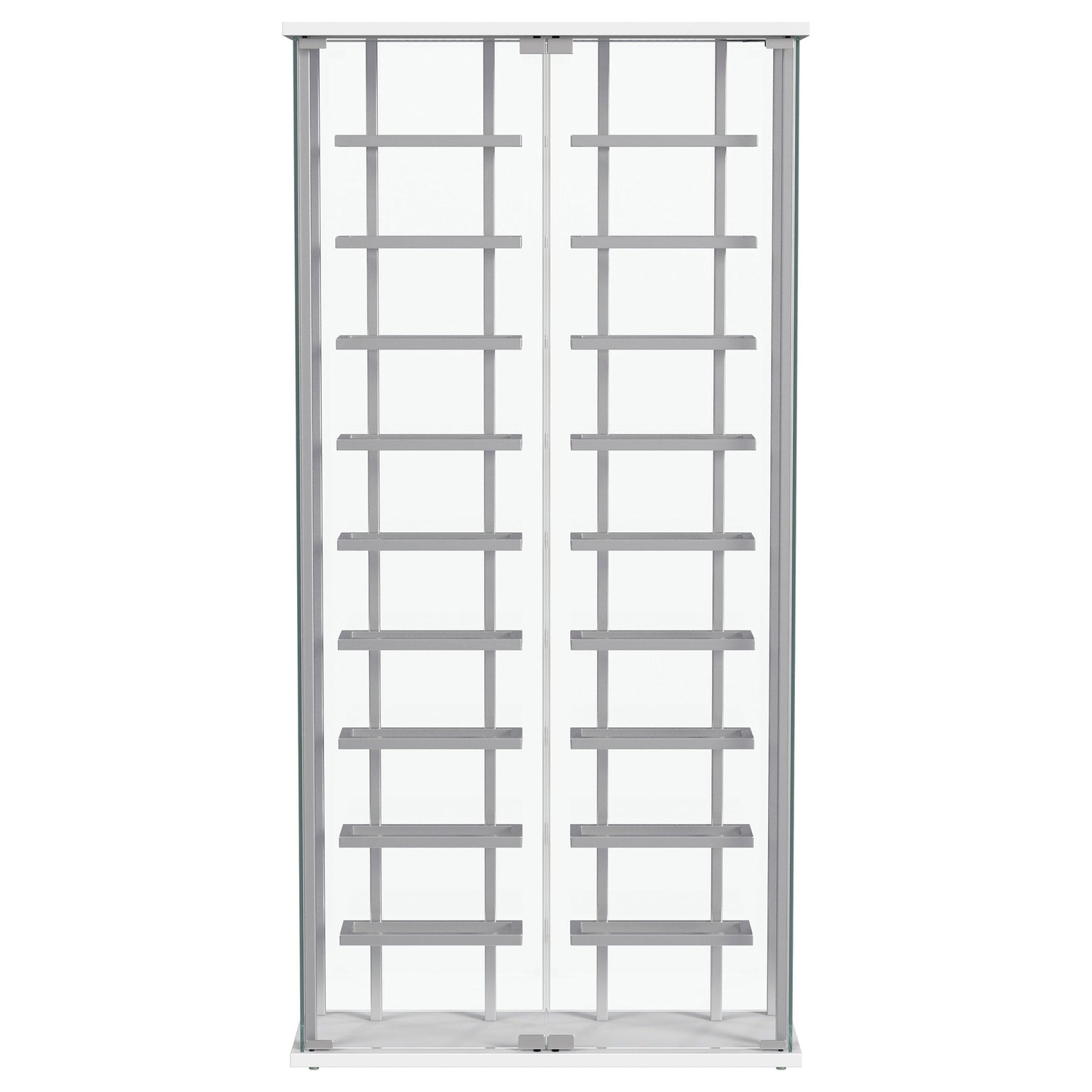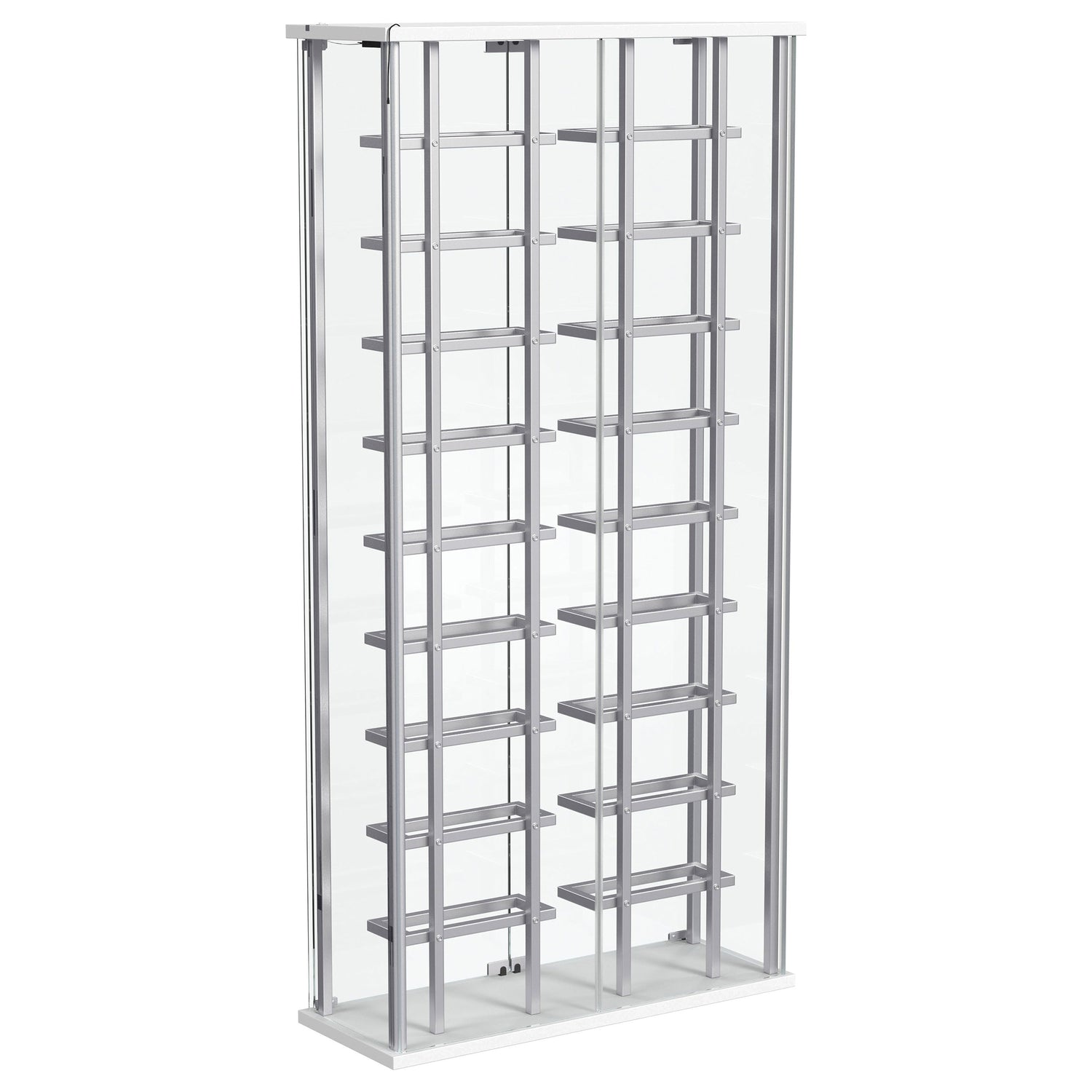 Put the spotlight - literally - on your favorite vintages with a modern bar cabinet. The glass cabinet is crystal clear with built-in LED lighting, offering bright, open flair in your dining room or home lounge. The cabinet features two glass doors with chrome hardware, offering a matching look to interior shelving. Shelves hold up to 18 of your favorite bottles of wine, showing them off to their best effect. The LED light is operated with a touch switch, making it simple and easy to highlight prized vintages.