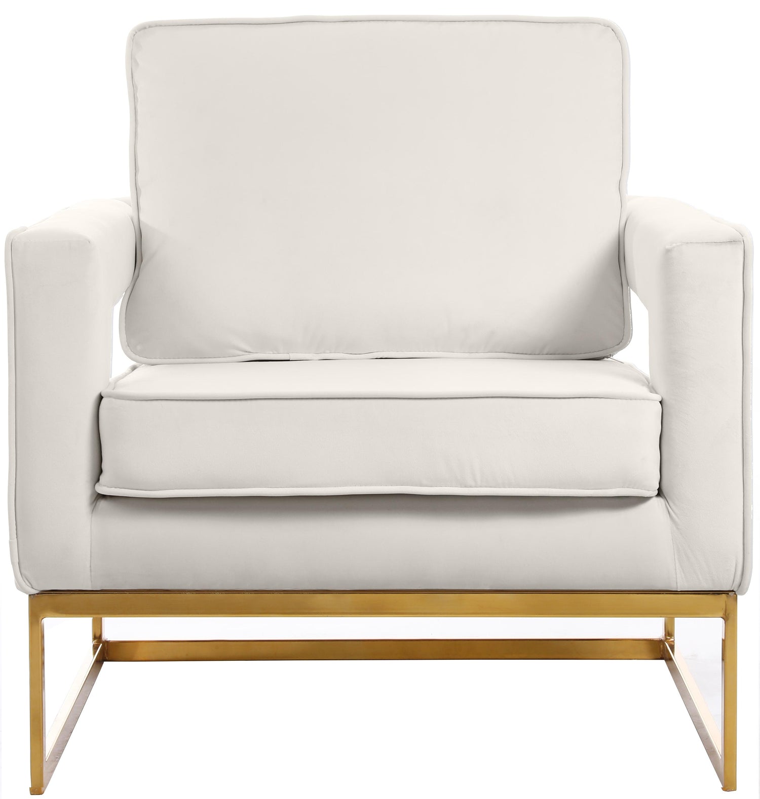 Kick back and relax in style with this eye-catching Noah cream velvet accent chair. Featuring a unique, sleek modern design, this chair's cream velvet upholstery and gold iron base is both plush and durable. The chair's cushion is padded with high-density foam, ensuring absolute comfort while you sit and read or watch TV.