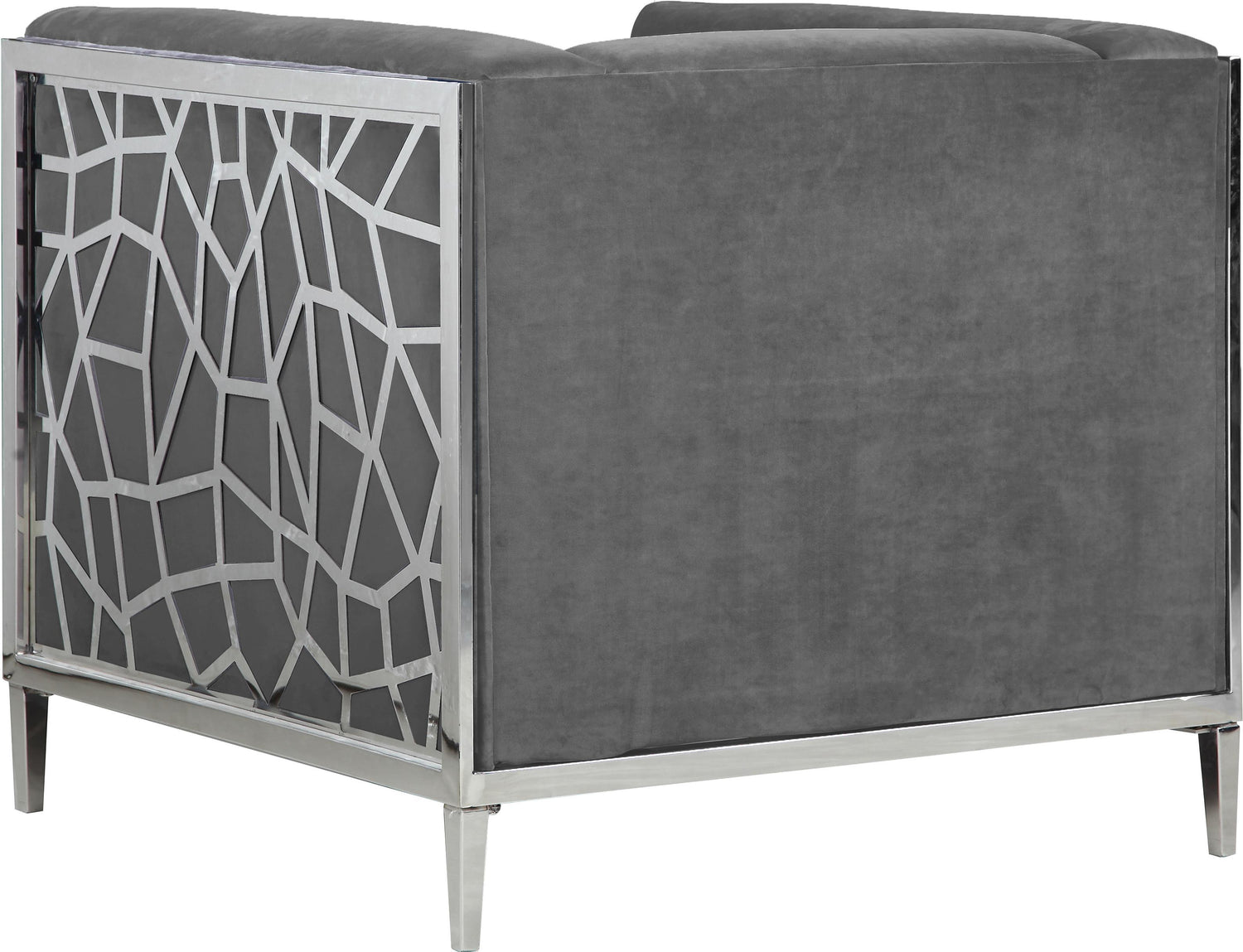 Catch the eyes of all who step foot in your home with this bold Opal grey velvet chair. Its chrome stainless steel patterned design creates a contemporary flair against its plush, grey velvet upholstery, creating a home accent piece that is both comfy and stylish. Its roomy design offers ample room to kick back and relax after a long day, while its stocky shape adds a daring touch to your decor.