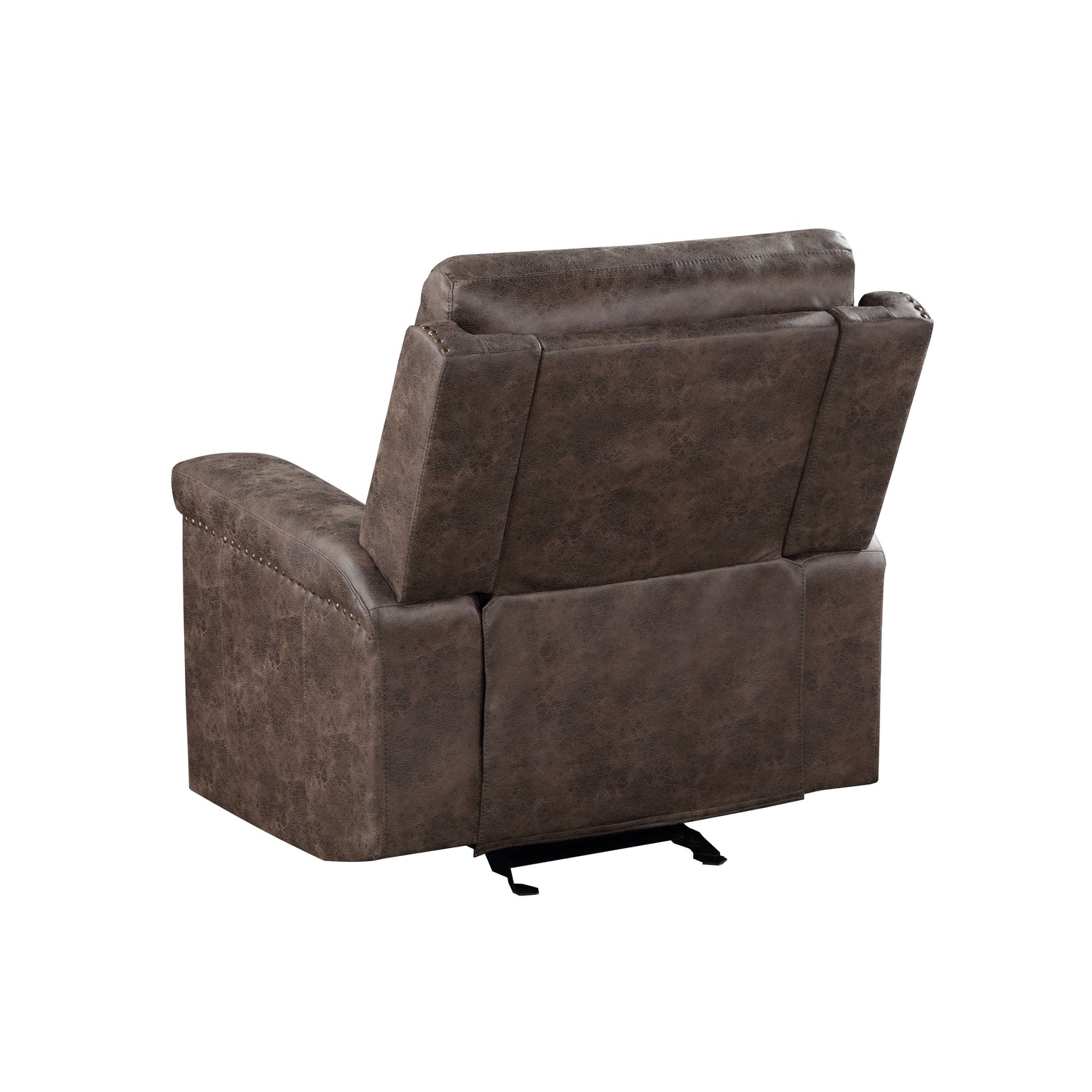 The Quade Glider Recliner in mocha brown offers the perfect balance of durability, comfort, and timeless style. Built on a strong frame made from premium hardwood, plywood, and engineered wood, this recliner is designed to last. The plush bucket seat features a high-performance coil spring system and foam cushioning, ensuring long-lasting softness and support by distributing weight evenly to prevent sagging and maintain its shape. The easy-care 100% polyester fabric, with its rich, mottled brown finish, replicates the luxurious look of leather while providing superior breathability and a soft, inviting feel. With smooth-gliding motion mechanisms, you can effortlessly recline for a deeply relaxing experience. Combining modern and traditional design elements, the nailhead trim and tailored backrest add a touch of classic elegance, making this recliner a versatile and stylish addition to any room.