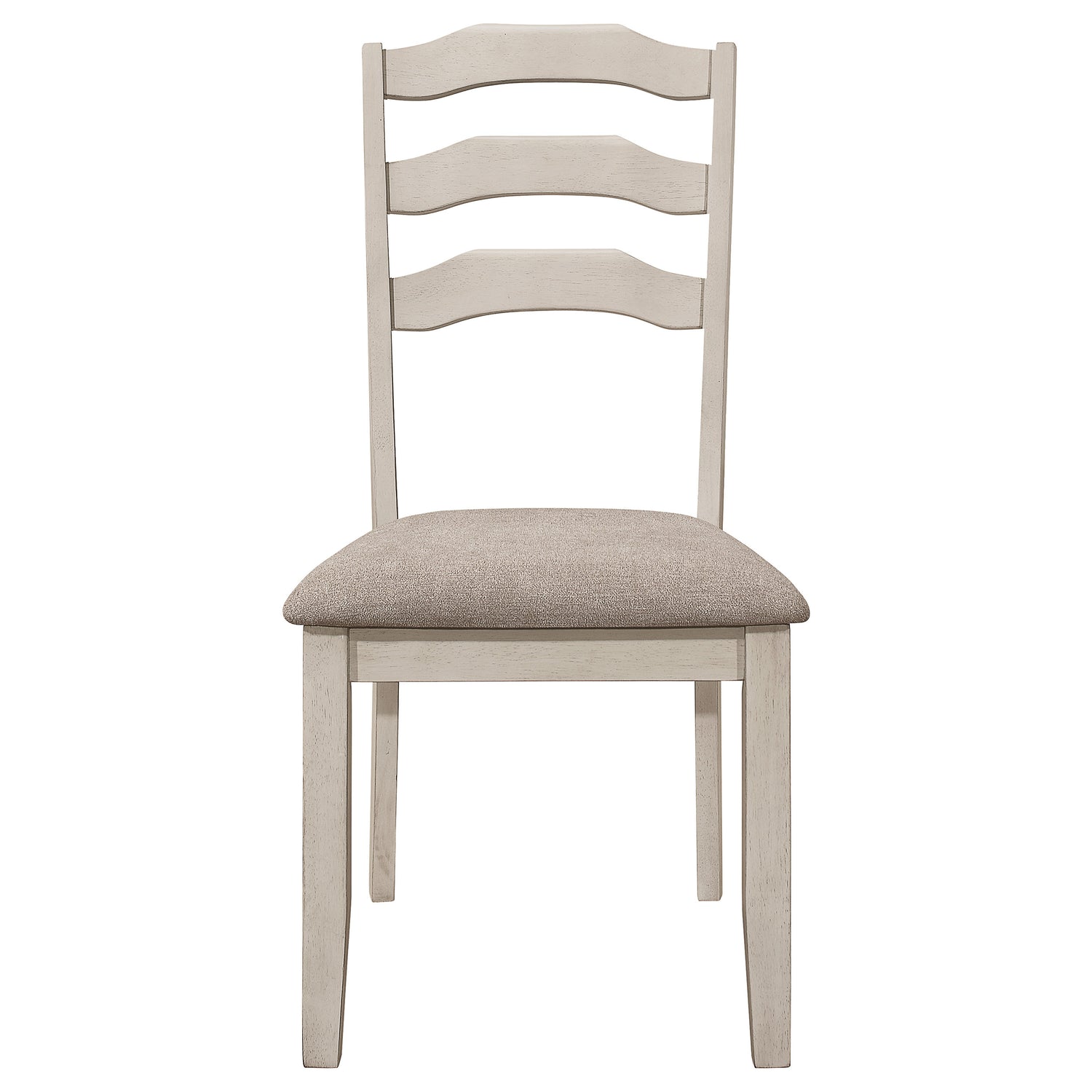 Create a cozy atmosphere with this modern farmhouse and coastal cottage dining set. The starburst design on the mindi veneer table top, supported by solid Asian hardwood legs, and rustic cream finish on the table apron and legs, add a country charm to your dining area. The ladder back chair, with its distressed cream finish on the legs and back, features a khaki polyester fabric upholstered seat for comfort.