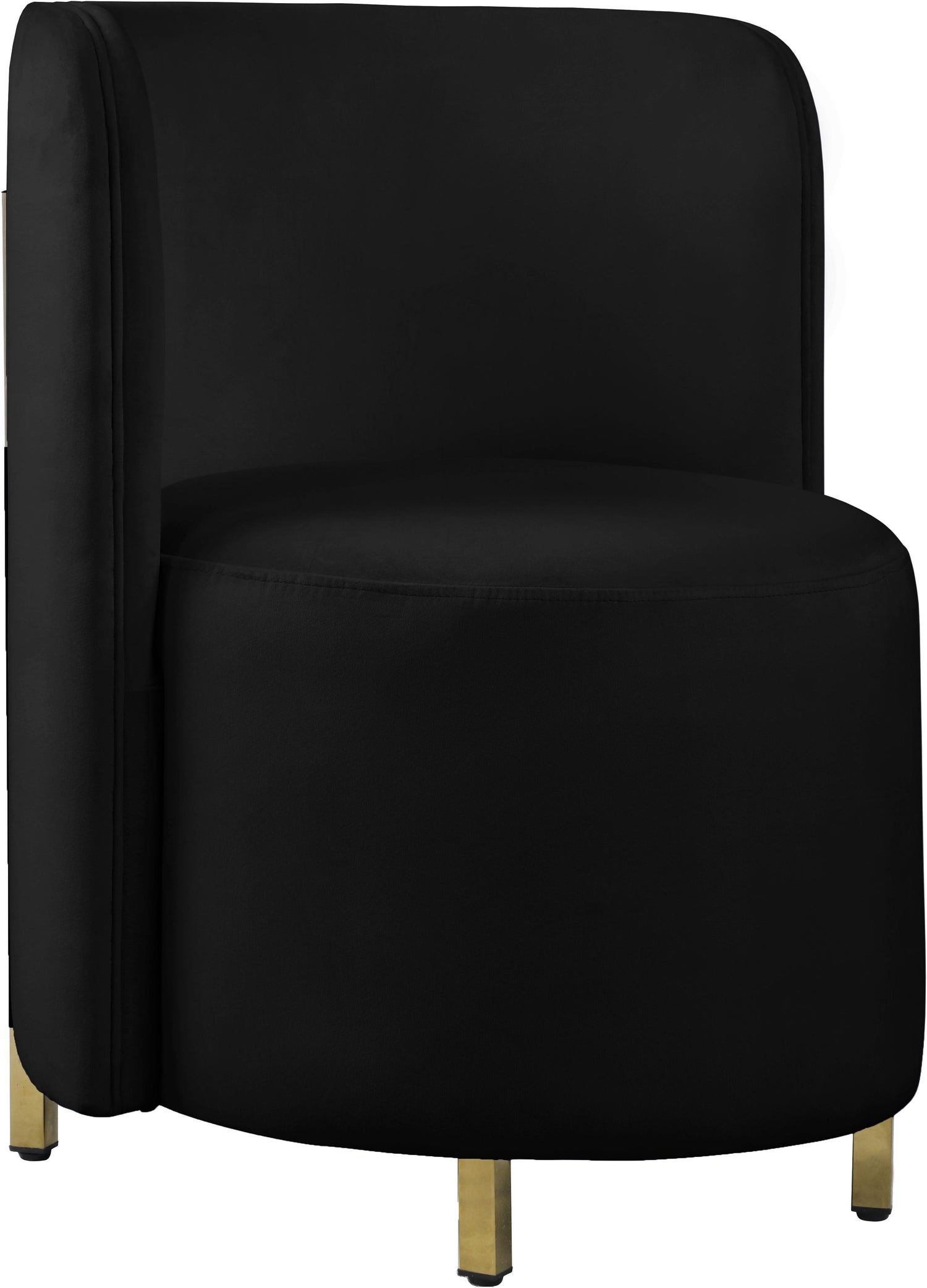 Create an envious look in your living room, parlor, bedroom or boudoir with this Rotunda velvet chair. This svelte little chair features a glamourous Hollywood vibe with its floor-length back and barrel design. The soft black velvet upholstery lends it an added upscale feel, and the gold metal legs round out its contemporary panache. A wooden frame makes the chair a sturdy addition to any room.