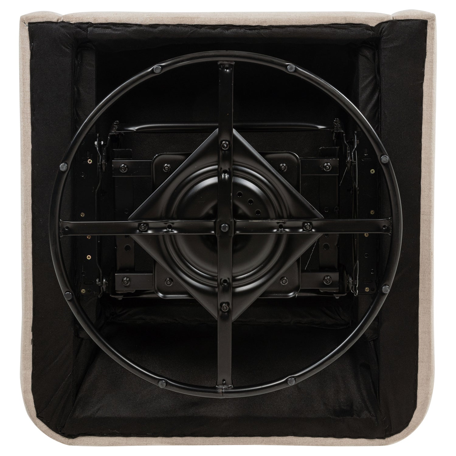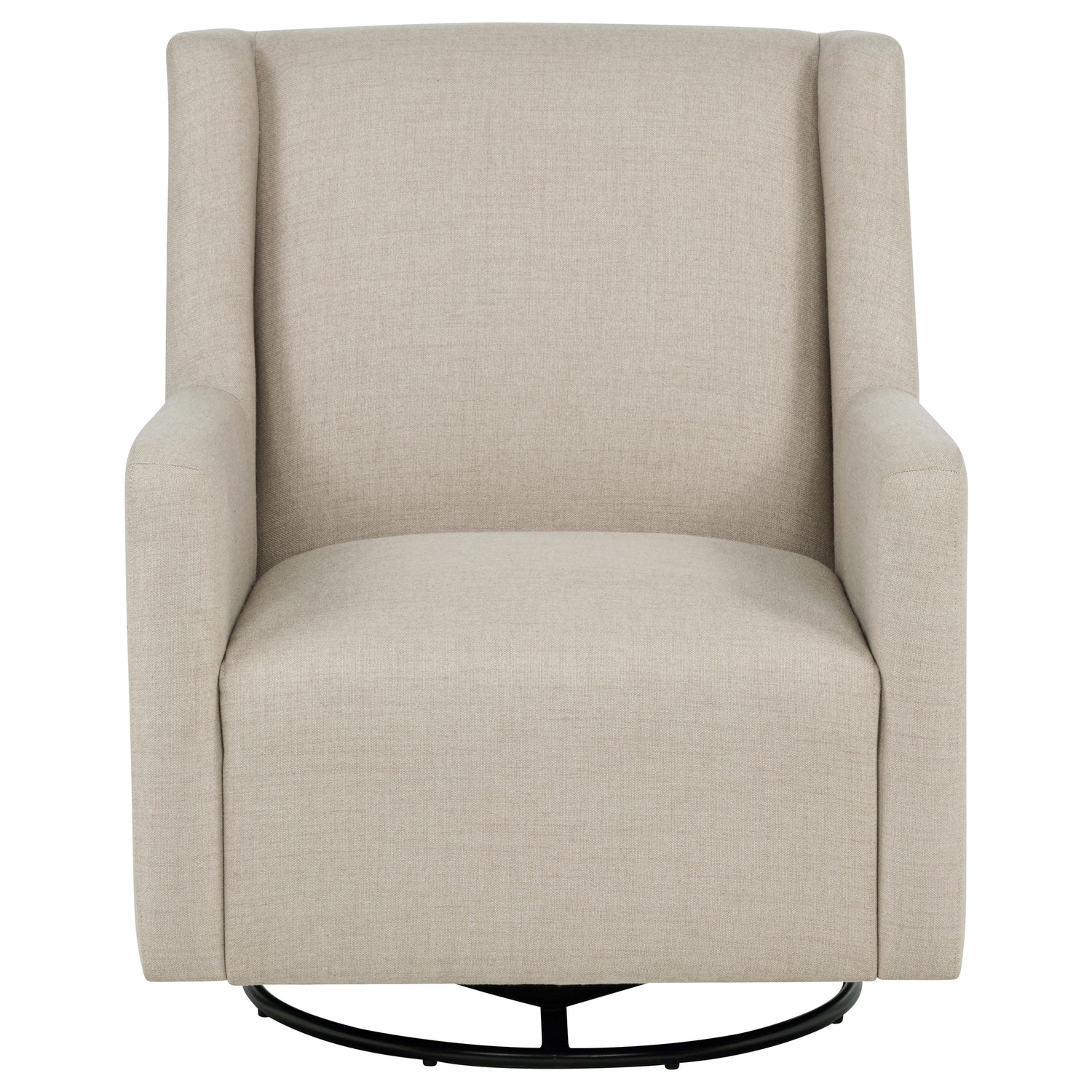 Comfort flows from every angle in this swivel accent chair. With gently sloped arms and a tall, tailored backrest, it wraps the body in a soft, supportive shape. Upholstered in smooth fabric and mounted on a black metal base, it glides with ease to match your movements. Clean edges, plush cushioning, and fluid form blend practicality with understated romance—making it ideal for nurseries, reading nooks, or refined lounge spaces. Key Features: • Swivel accent chair with tall backrest and low-profile silhouette for modern comfort • Upholstered in latte-colored polyester fabric for a soft and versatile neutral tone • Subtly sloped arms flow into the seat for an elegant and supportive arm profile • Smooth 360-degree swivel motion supported by a matte black finished metal base • Padded with supportive foam cushioning for lasting comfort in any setting • Constructed from fabric, foam, metal, and plywood for durability and strength