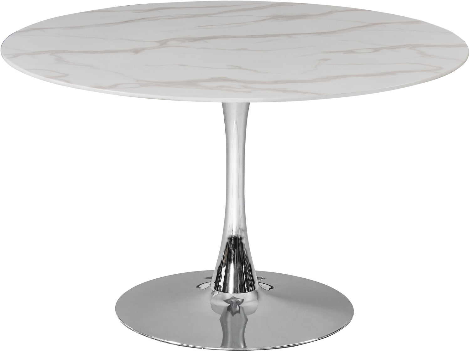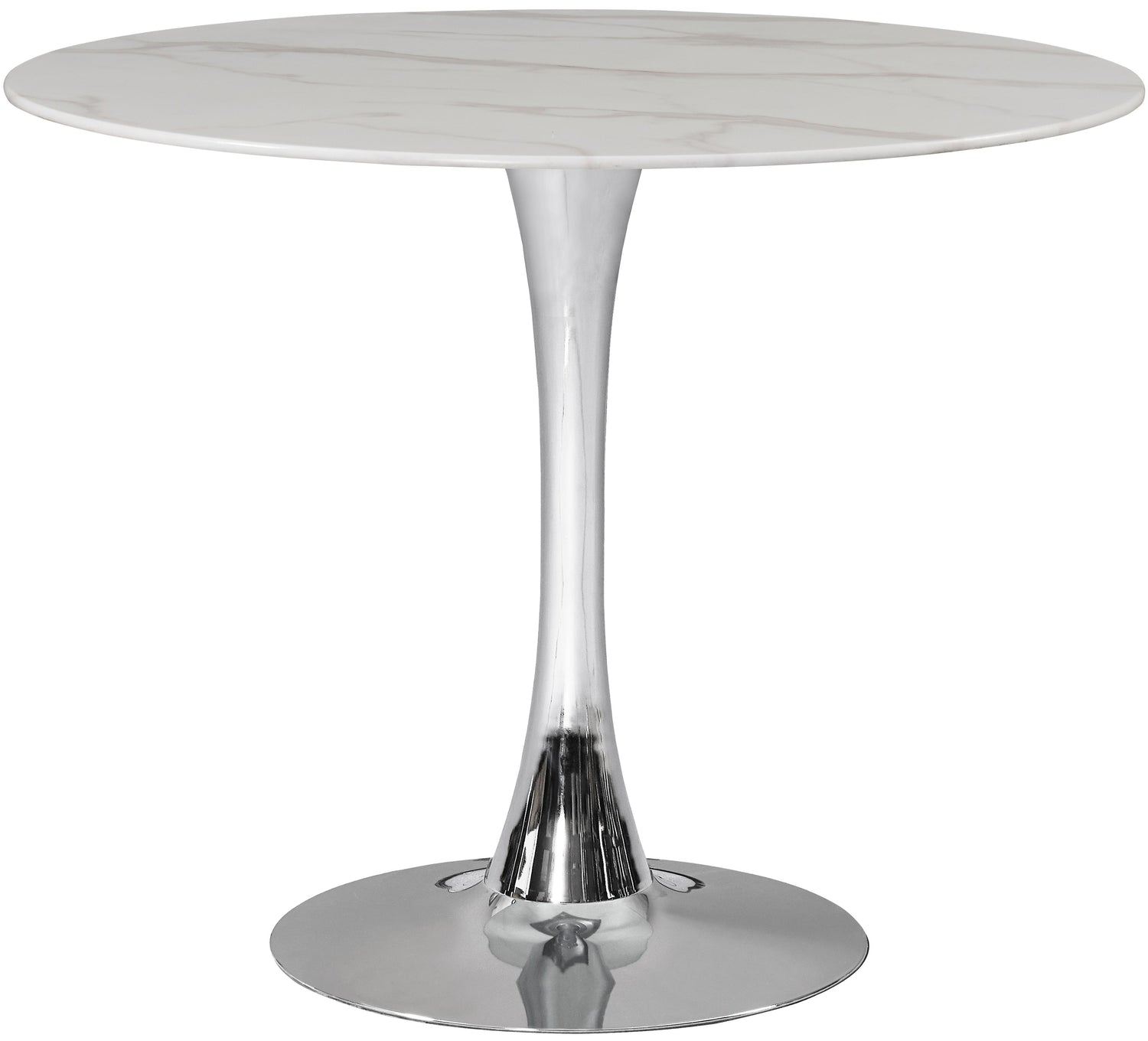 Add the Tulip 36" dining table to your kitchen, den or office to enjoy its petite size and elegant lines. The tabletop is made of 10MM thick glass with a glamorous marble veneer. A shiny silver pedestal base adds to the appeal of this gorgeous piece, and lets it fit into smaller spaces comfortably. Choose from a wide array of available matching chair styles to complete your contemporary style d?�cor.