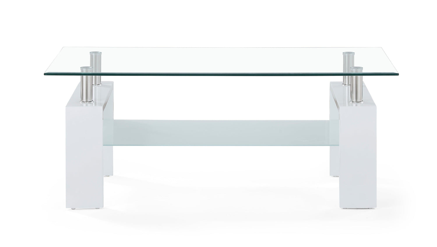 This table is complete with clear top glass and frosted bottom glass with glossy white legs to finish the look.
