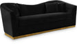 Make the Arabella Black Velvet Sofa your favorite naptime spot. This handsome sofa is upholstered in black velvet for a glamorous touch and is accented with gold stainless steel around its base for a touch of modernity. Its curvy back gives it a graceful look in your living room or den, and it comes with coordinating throw pillows that beckon you to sit down and rest (or nap) for a spell.