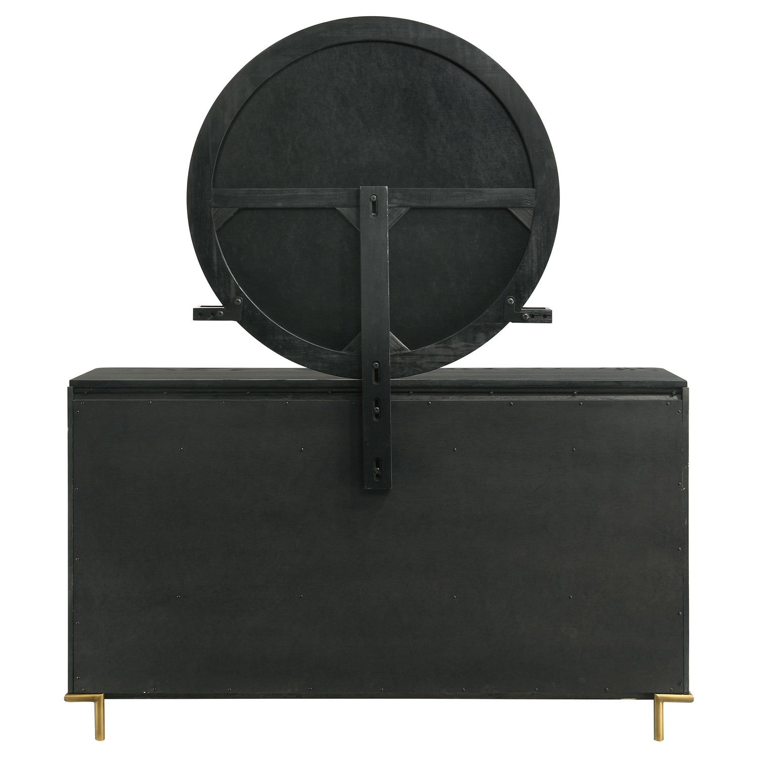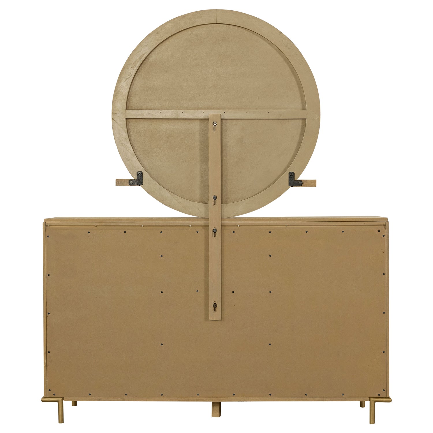 Step into a world of understated elegance with the mid-century modern eight-drawer dresser, its wire-brushed sand wash finish providing a serene backdrop to the aged brass accents. The sleek design, with softly rounded corners and slender legs, offers a sophisticated aesthetic while ensuring ample storage. The felt-lined top drawers cater to your delicate belongings, blending functionality with thoughtful design. Above, the modern dresser mirror, complete with a built-in tray and spacious round reflection, maximizes your space, allowing for a clutter-free surface and a tranquil bedroom escape.