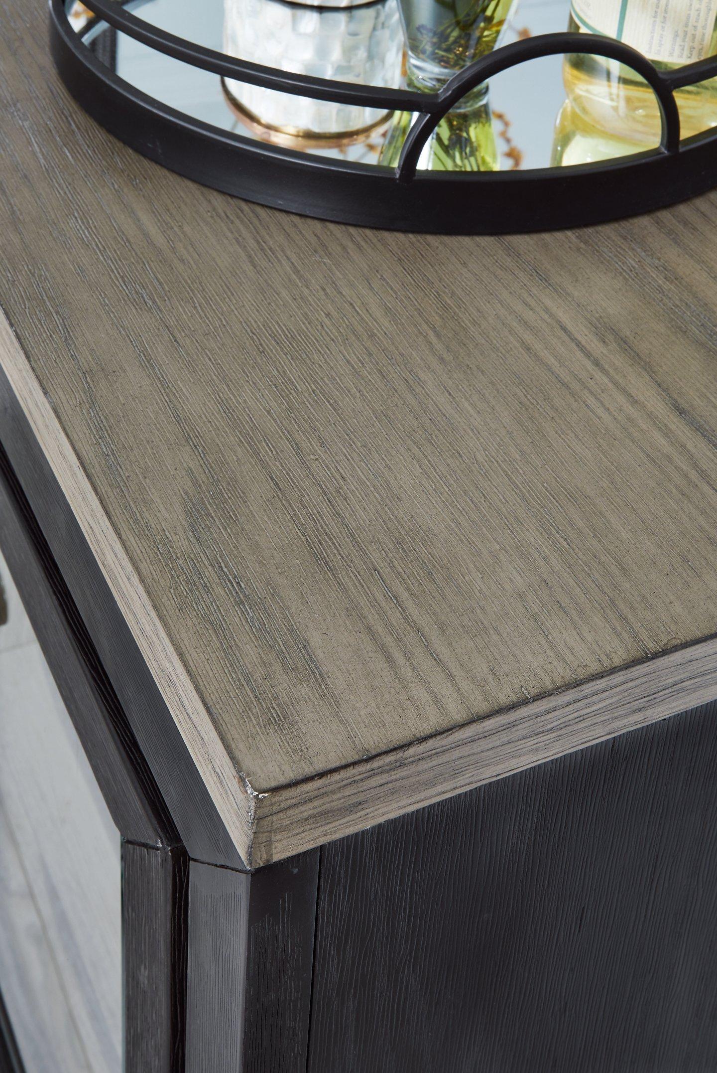 - Two-tone finish (brushed black and dusty grayish brown wood tone)