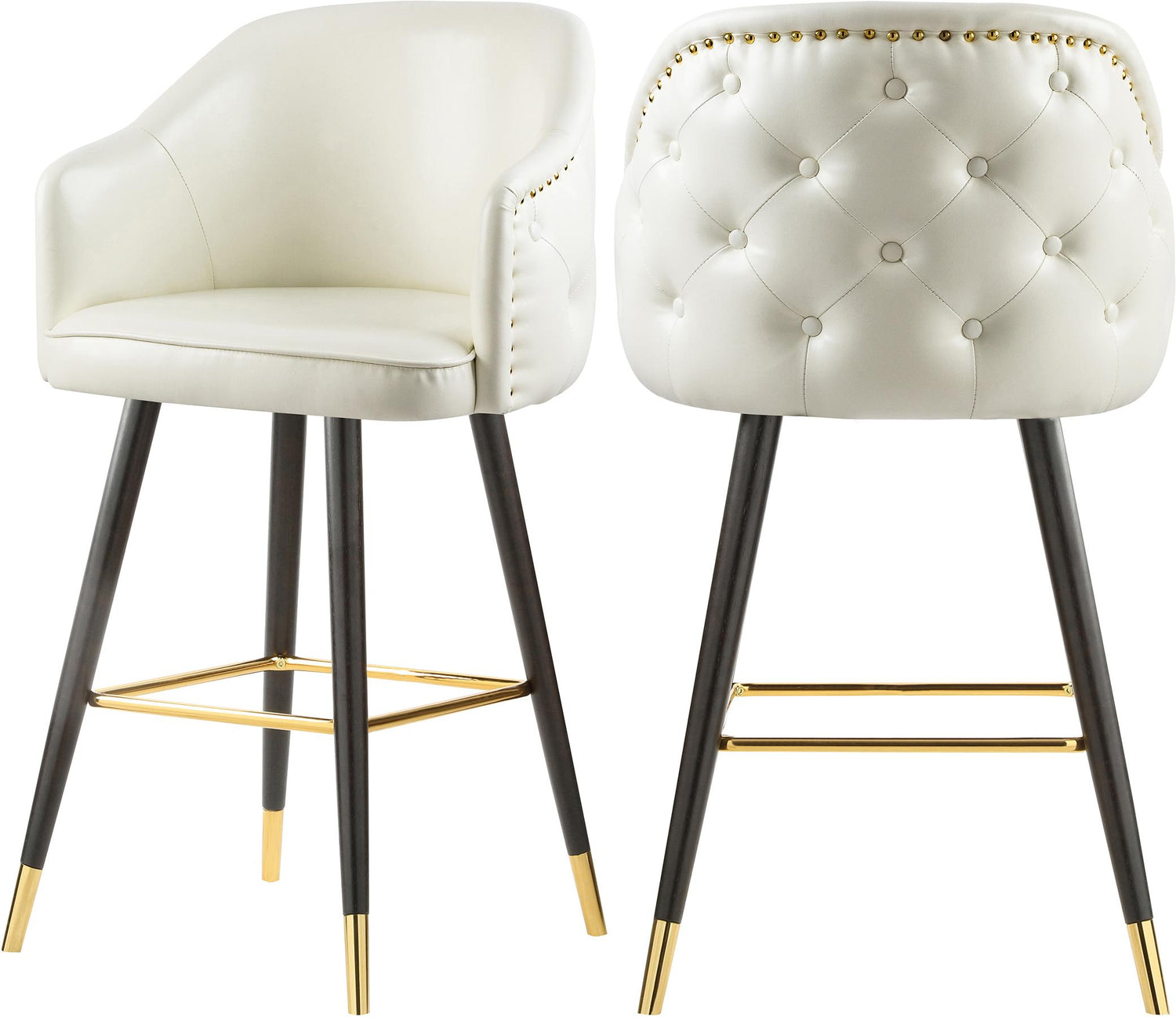 Traditional beauty comes to your home bar or counter area with this Barbosa faux leather bar or counter stool. The rich, soft white faux leather looks so real, folks will really think it is. The chair rests on espresso wooden legs and has a gold footrest with gold caps on its tips for a modish finish. Deep tufting on the back of the seat adds a classic sense of refined style.
