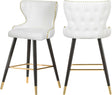 Sit comfortably and stylishly in this Hendrix faux leather bar and counter stool. This handsome stool features white faux leather upholstery on the seat and back, ensuring that you get a luxe and refined look without paying a lot. But don���t worry���no one will know that this buttery soft upholstery is not the genuine thing. The stool���s espresso wood legs and gold footrest with gold caps lends it a definitive contemporary punch.
