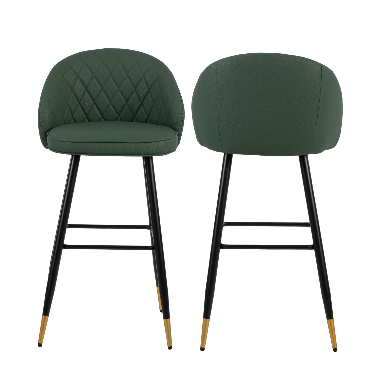 The Oliver Green Faux Leather Bar Chair set combines contemporary style with practical features to enhance any modern space. Each set includes two bar chairs with a sleek, arched back and low profile, offering a chic yet refined aesthetic. Crafted from eco-friendly vegan leather, the chairs deliver the luxurious look of leather without the maintenance, with intricate diamond tufting for added sophistication. The sturdy, tapered black iron legs provide excellent stability, resisting bending or breaking, and are accented with subtle gold detailing for a touch of elegance. Dual-purpose footrests ensure both added stability and a comfortable spot to rest your feet. A perfect blend of style and functionality, these bar chairs offer long-lasting comfort and timeless design—an excellent addition to any home or bar setting.
