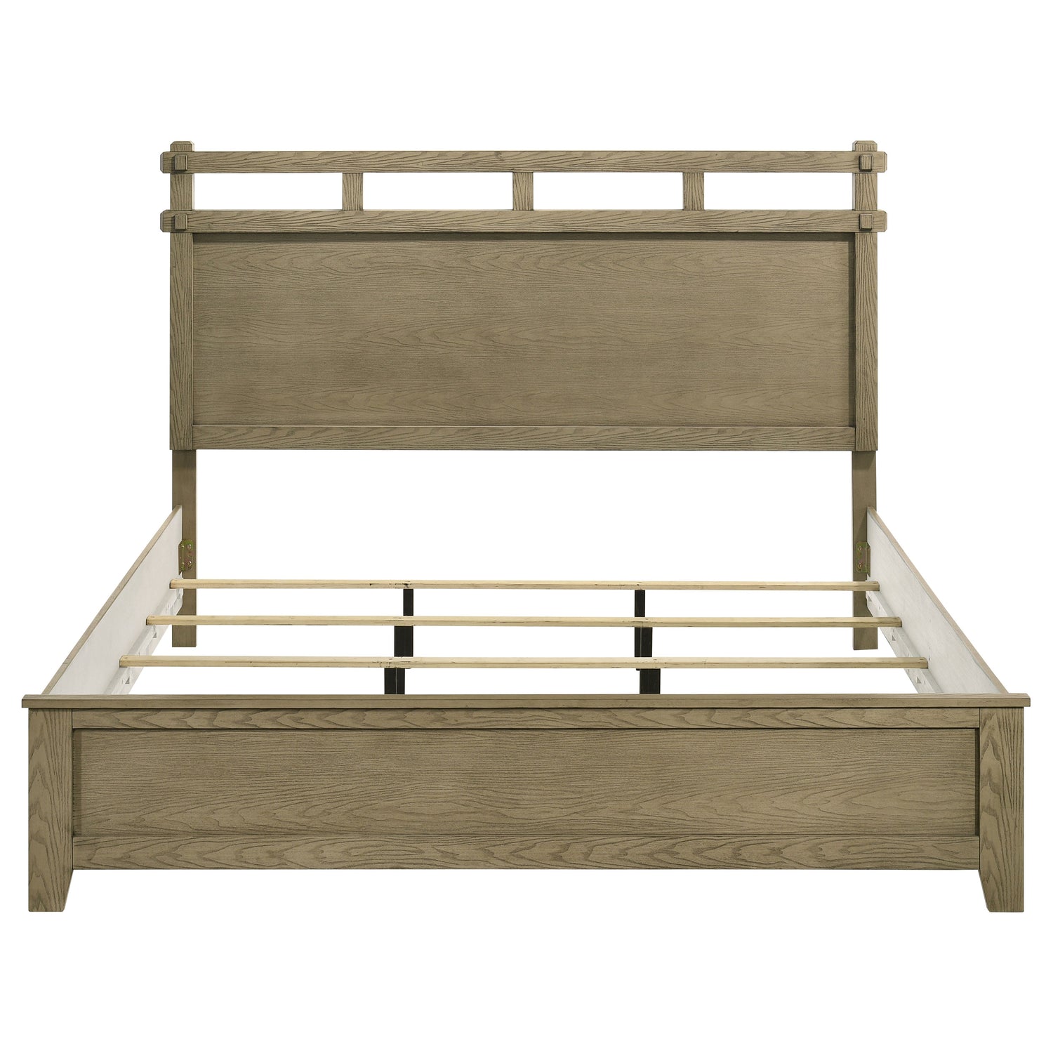 Blending clean lines with warm character, this panel bed delivers timeless style for transitional spaces. Crafted from rubberwood with engineered wood veneer embossed in an oak grain texture, its frame showcases a refined vineyard oak finish. A distinctive open-slat headboard design adds depth and craftsmanship to the silhouette. Designed for use with a foundation, this bed is a sturdy and stylish centerpiece for the modern bedroom. Key Features: • Queen bed with a bold panel design and open-slat headboard framing • Constructed from rubberwood and engineered wood veneer with oak grain embossing • Vineyard oak finish adds warmth and dimension to the bedroom setting • Requires a standard foundation to support your preferred mattress setup • Linear profile complements transitional, rustic, or contemporary interiors • Durable frame offers long-lasting support and elevated design appeal