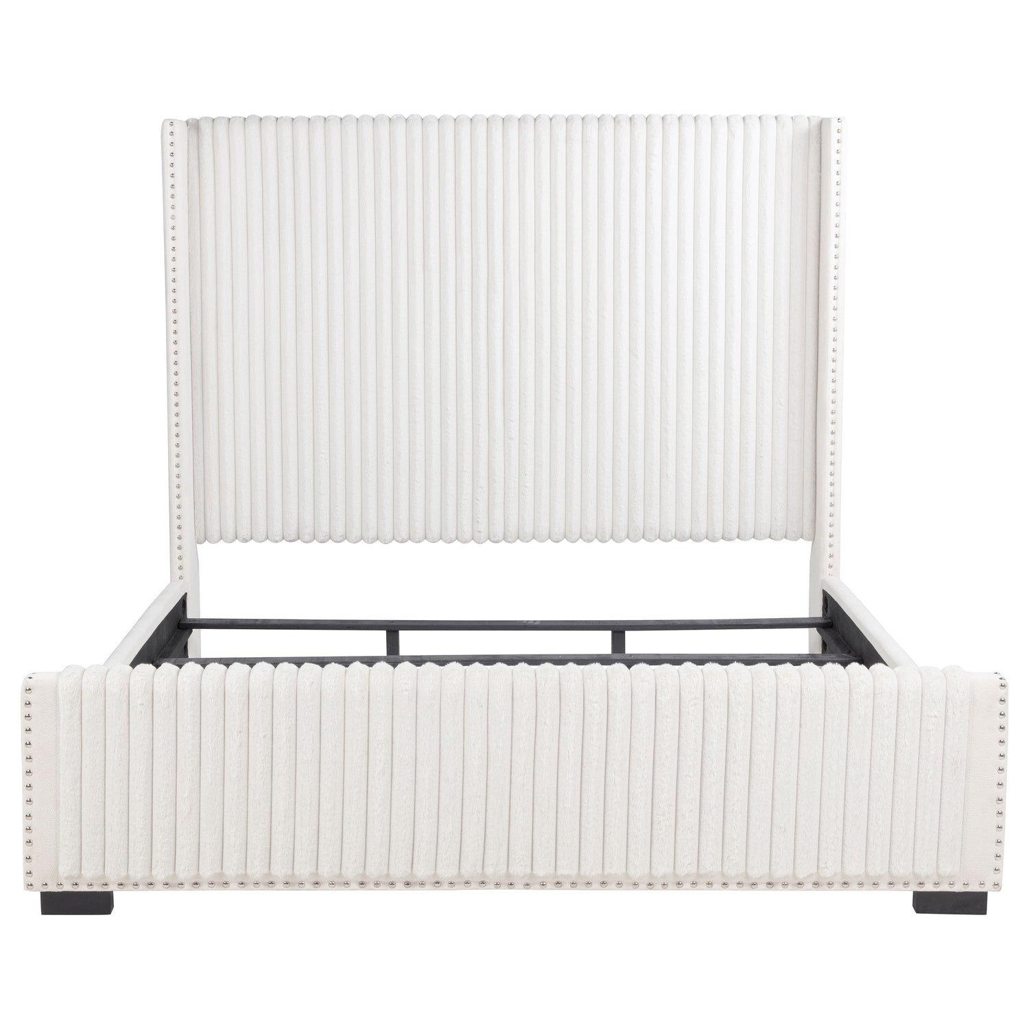 Instill luscious decadence with a modern glam upholstered bed. Cream fabric over plush foam cushioning creates a lush look and impeccable comfort when lounging. The bed is defined with its tall, wingback headboard, which boasts vertical channel tufting for the perfect hint of texture and depth. Nailhead trim traces the clean, straight lines of its silhouette, with a matching low footboard to complete the look. Choose white linens for a monochrome effect, or opt for vibrant colors to create a truly showstopping effect in your bedroom.