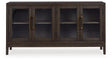 Dressed to thrill, this simply stunning dining server offers a high-design look at a down-to-earth price. Ultra sleek lines are accentuated with a dark waxy brown oak-tone finish that’s so easy on the eyes. Custom bar pulls on the double-door cabinets emphasize the server's clean, modern lines, while their brass-tone finish and metal accents in the same coloration complete the upscale aesthetic. Beautiful inside and out, glass front doors showcase the adjustable shelving to create a display and storage piece with a timeless look that's made to last.