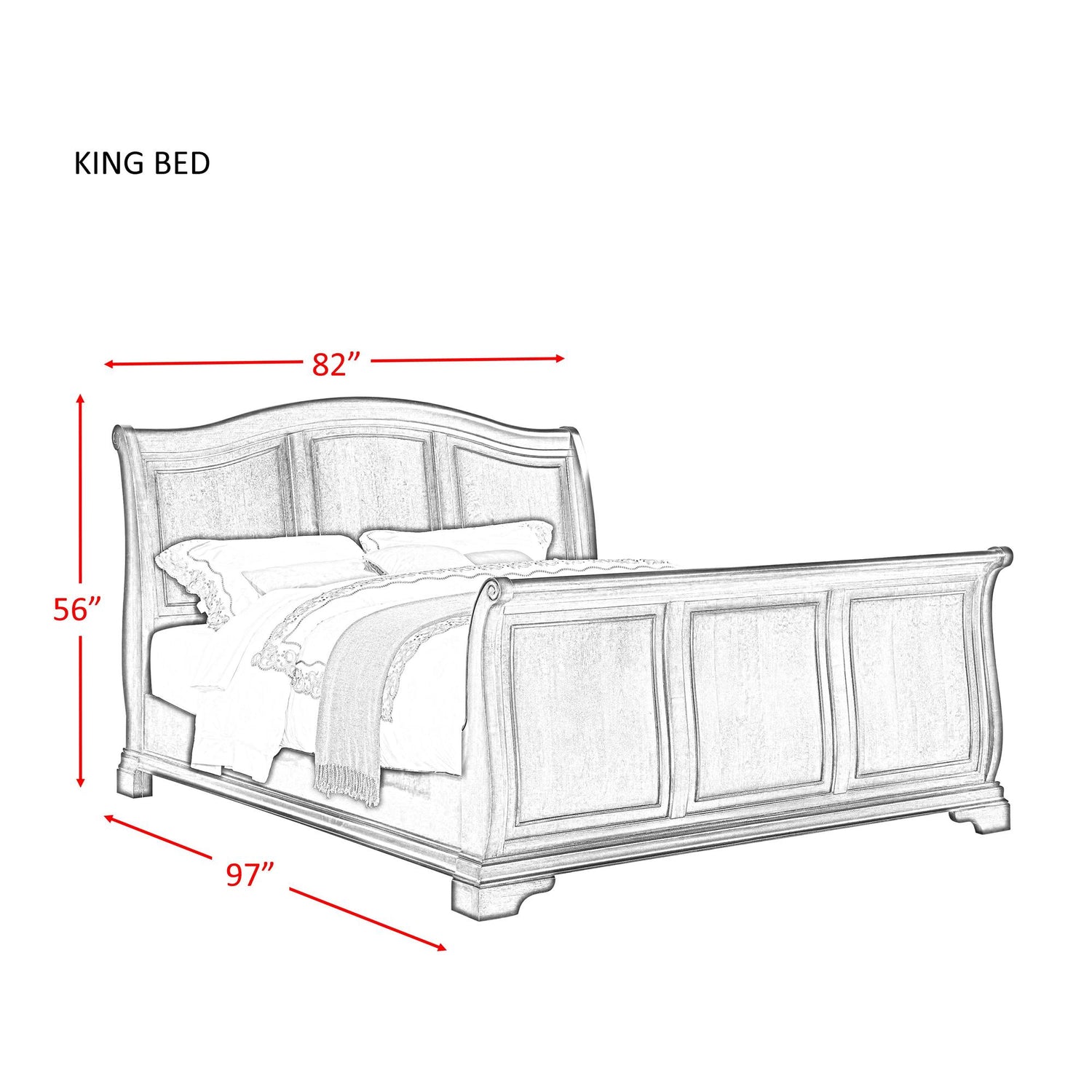 The Cameron Cherry King Sleigh Bed combines curves and sleek lines with a warm cherry finish to render classic refinement. This bed has a gently arching headboard with carved panels and a sleigh style footboard. - Traditional Cherry Finish - Elegantly curved sleigh headboard and footboard - Louis Philippe inspired styling. Requires both mattress and box spring - sold separately Birch veneers, solid wood and select hardwoods 97 D x 82 W x 56 H, 164lbs. 1 Year Limited Manufacturer Warranty